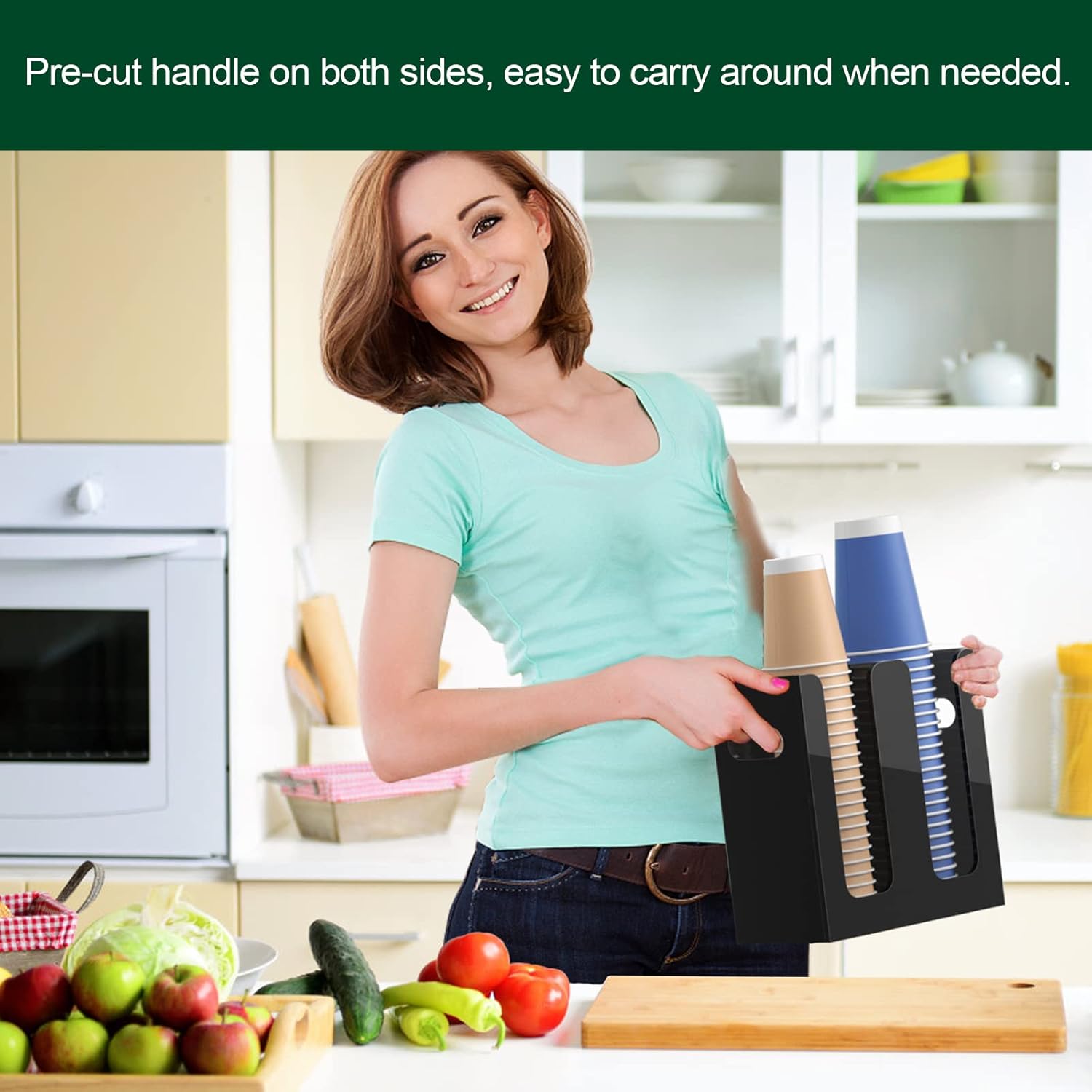 - Material - made of 4mm thickness acrylic, the disposable cup organizer is an ideal container to make your home kitchen bathroom or break room office coffee station area less cluttered, it keeps plastic or paper coffee cups or tops organized. No more cups and lids floating around when wind picks up.