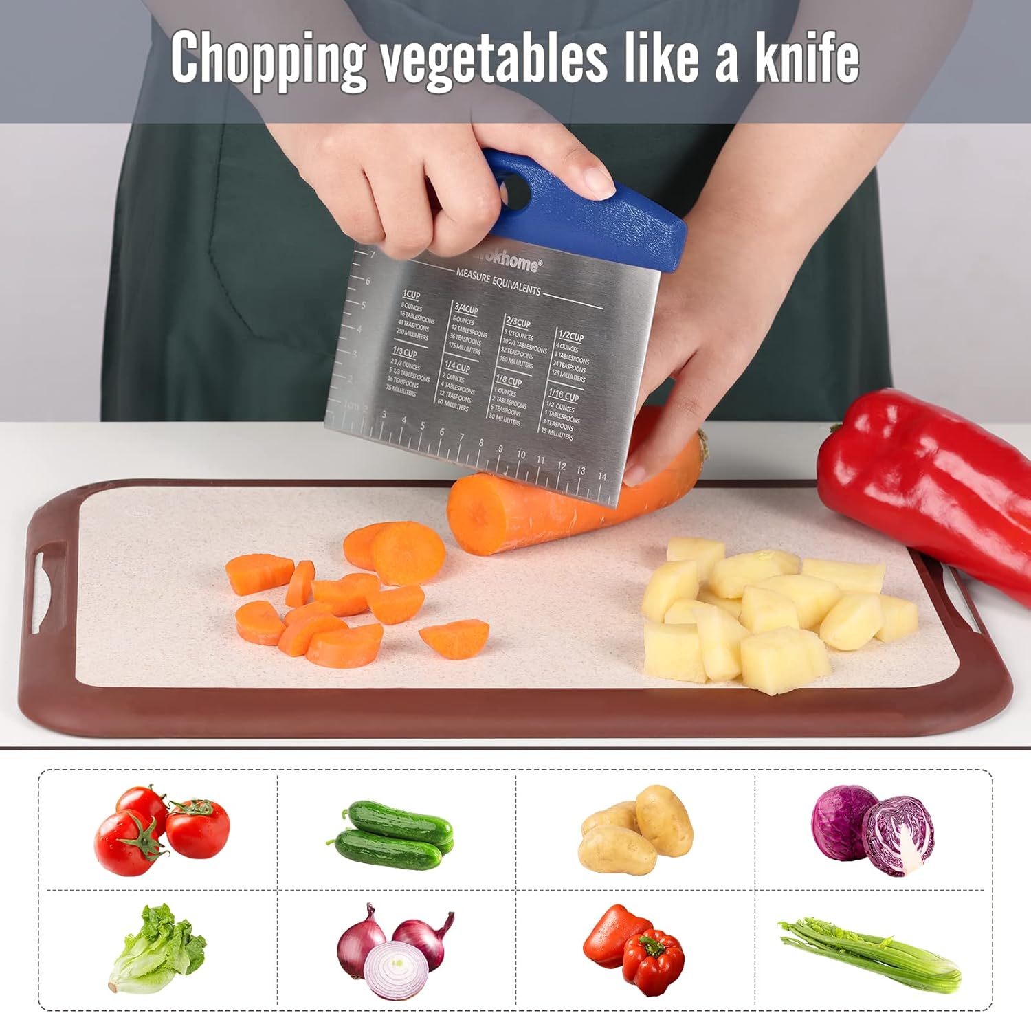 - Sharp bench scraper chopper: The pastry scraper is made from premium 430 stainless steel which is anti-rust and anti-deformation. The sharpness can stand the test of time and will give you a good clean cut for ingredients