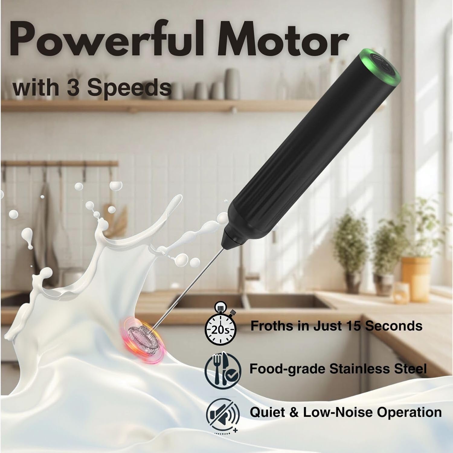 Milk Frother Handheld,3-Speed Rechargeable Coffee Foamer Drink Whisk with 3 Stainless Steel Heads Electric USB C Whisk for Coffee, Latte, Cappuccino, Hot Chocolate, Protein,Egg light Black