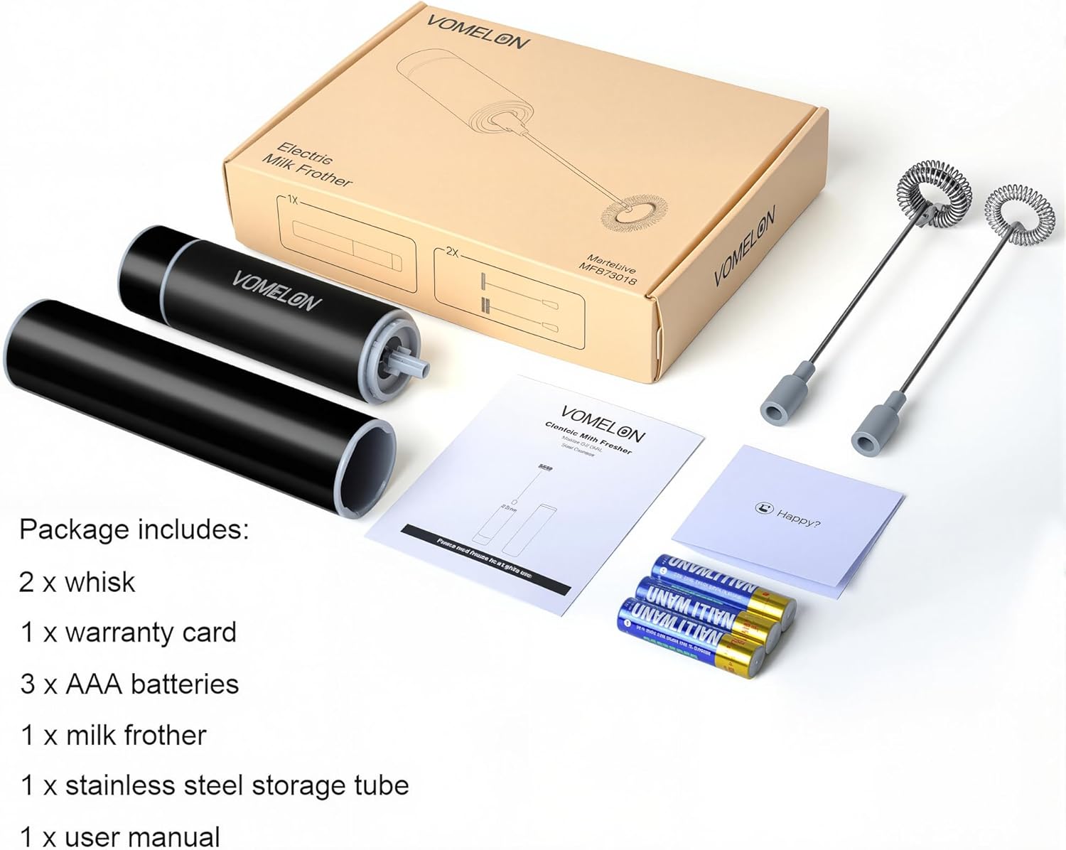 - 【DESIGNED FOR HOME AND TRAVEL】-The battery operated milk frother is powered by 3 AAA batteries (included) and designed with a storage tube to prevent dust from damaging and keep the whisks clean. Putting a small frother into your handbag or suitcase take up no space. It is a convenient and magnificent gift for your families, Get this drink mixer for your personal party and camping. Our milk frother will let you have a fantastic and fabulous experience.
