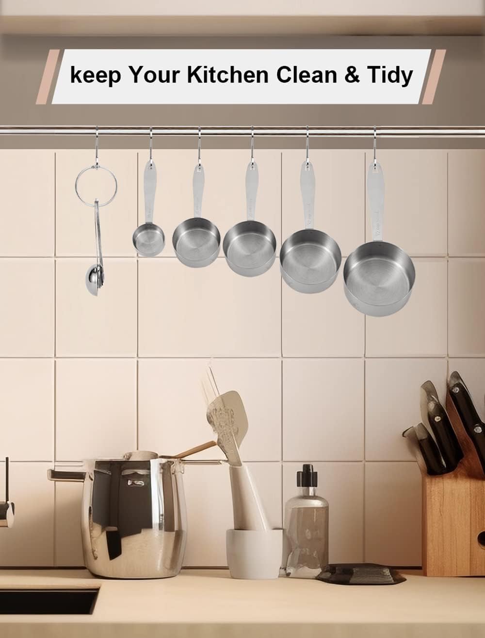 - Keep Your Kitchen Clean & Tidy: Stackable measuring cups and measuring spoons nest inside another for saving kitchen space. Detachable clip rings make measuring cups and spoons easy to organize and store in the drawer, or hang on a kitchen hook. It is sleek and classy. You also can hang them on your kitchen wall as decorations