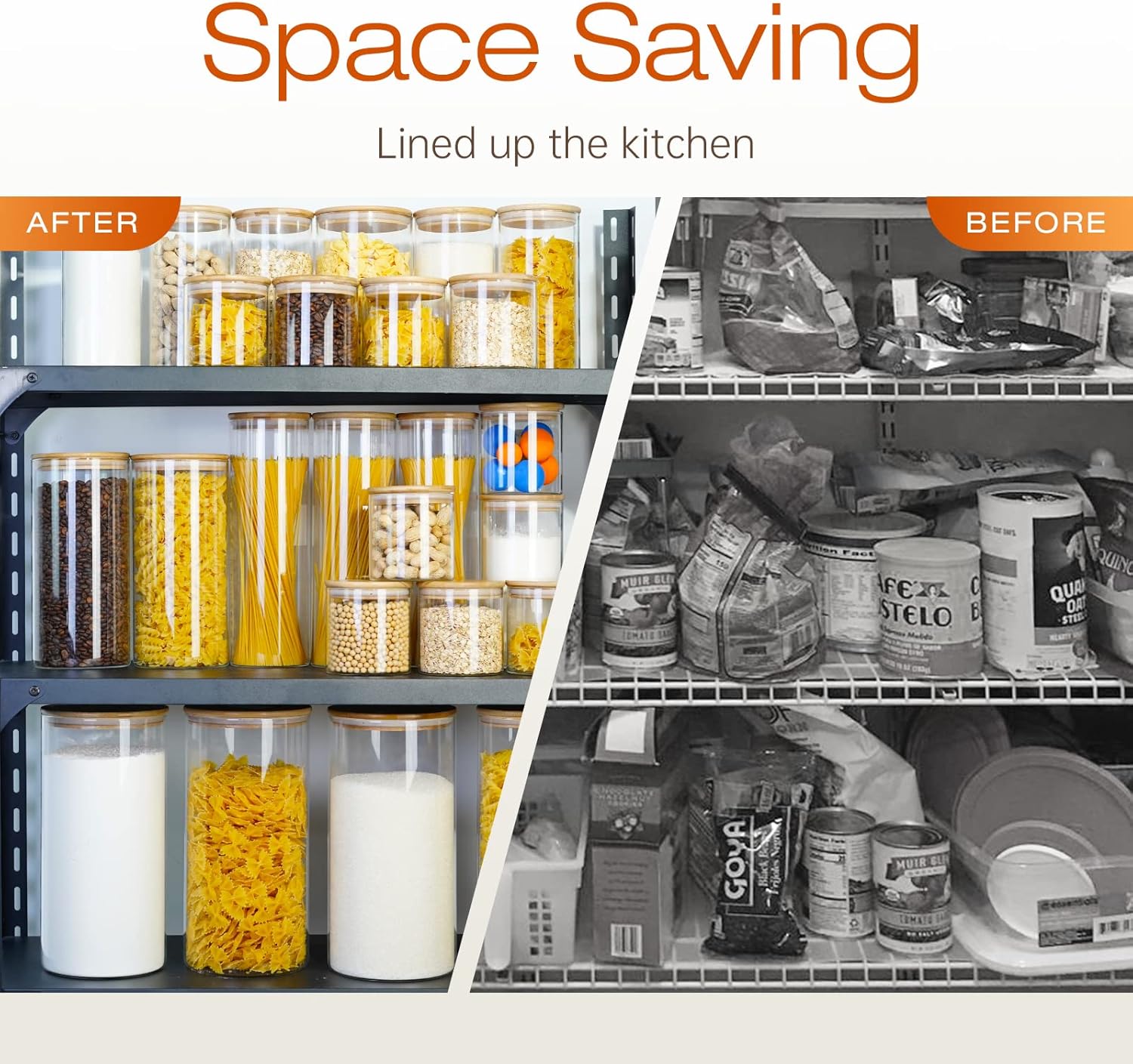 - 【 HD Clear Glass Jar & Boho Decor 】: Special HD glass provide the most transparent texture, makes you can clearly see through the contents of glass storage jars and the remaining stock, then you can convenient to refill the foods that is about to be used up. The natural bamboo lids and HD clear glass canisters is a beautiful boho decor for your kitchen, pantry, bathroom, or bars, etc
