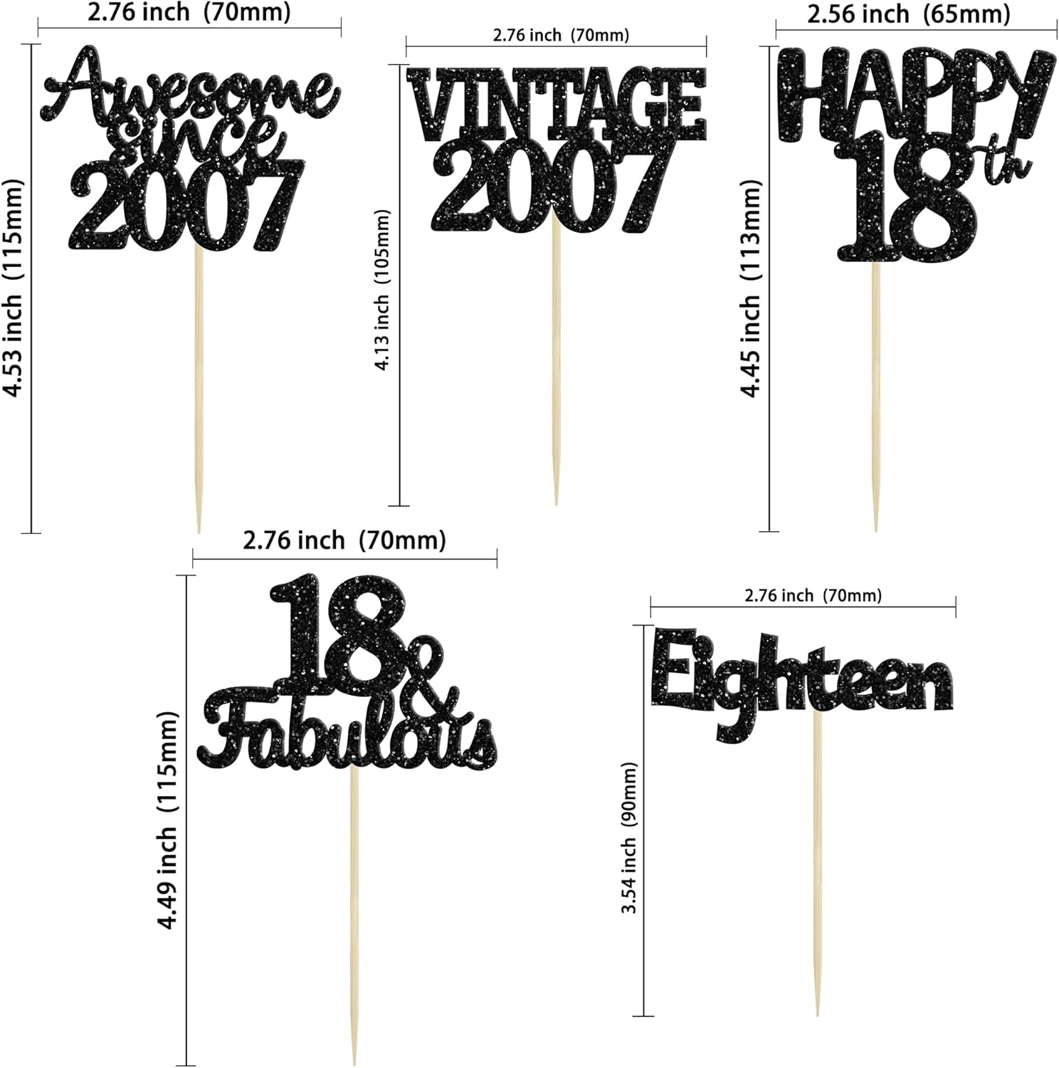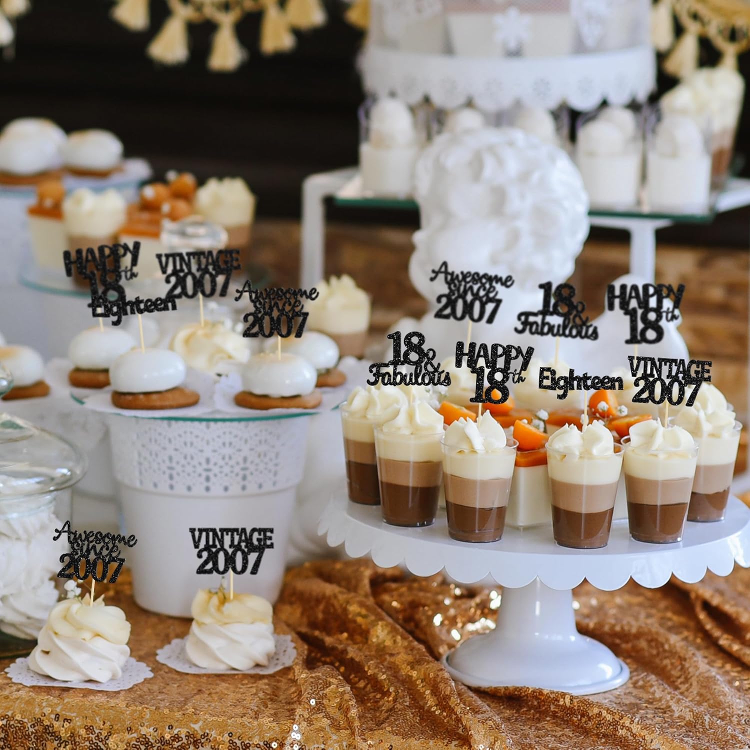 Gyufise 30Pcs Vintage 2007 Cupcake Toppers Glitter Eighteen Happy 18th Cupcake Picks Happy 18th Birthday Cake Decorations for Happy 18th Birthday Fabulous Anniversary Party Supplies Black