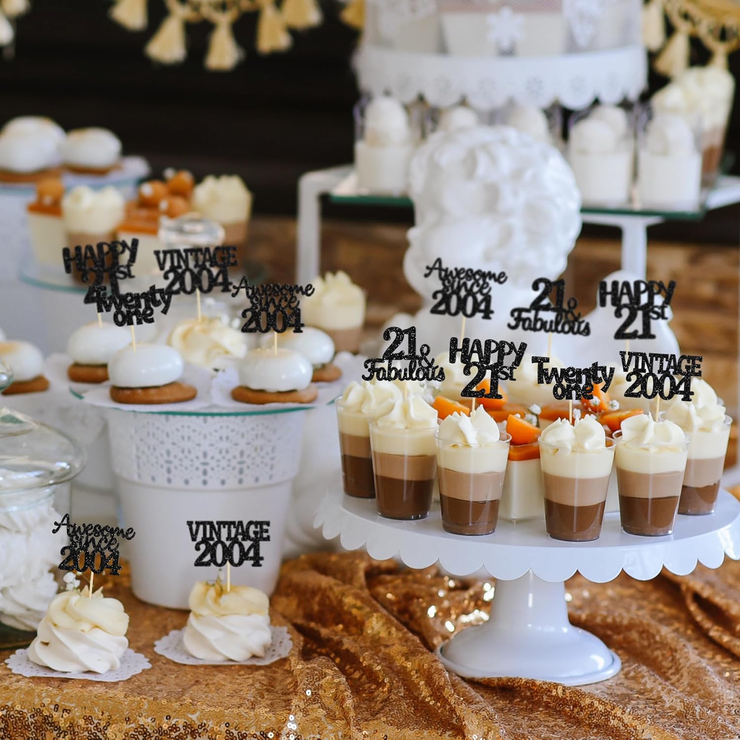 - ♡These glitter 21st birthday Cupcake Toppers are so cute and good for vintage 2004 theme party, 21st birthday party, 21st wedding anniversary birthday party cake decoration. They can make your cupcake more attractive and bring the fun to your party. You can also apply them for ice cream, fruits, cookies and other desserts.