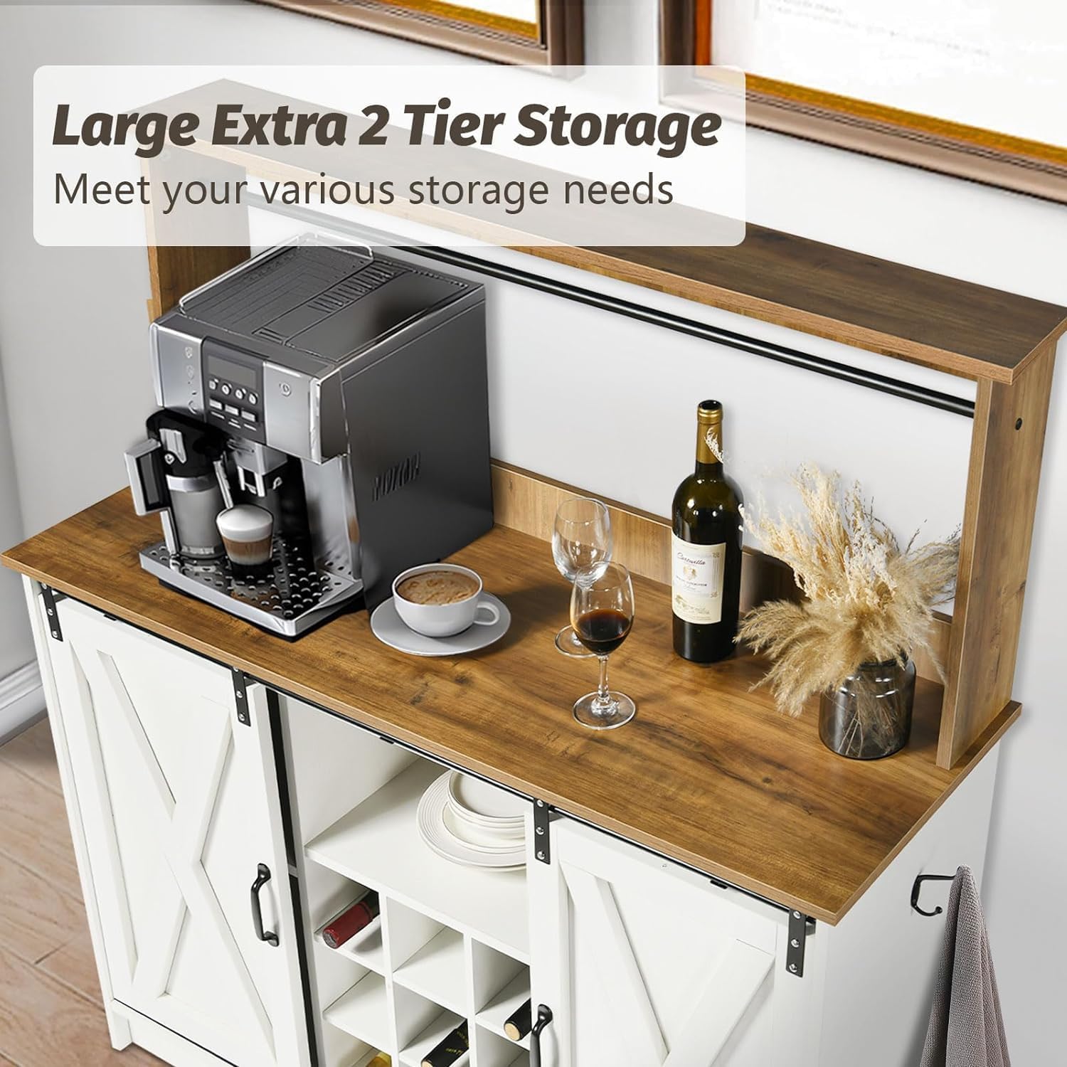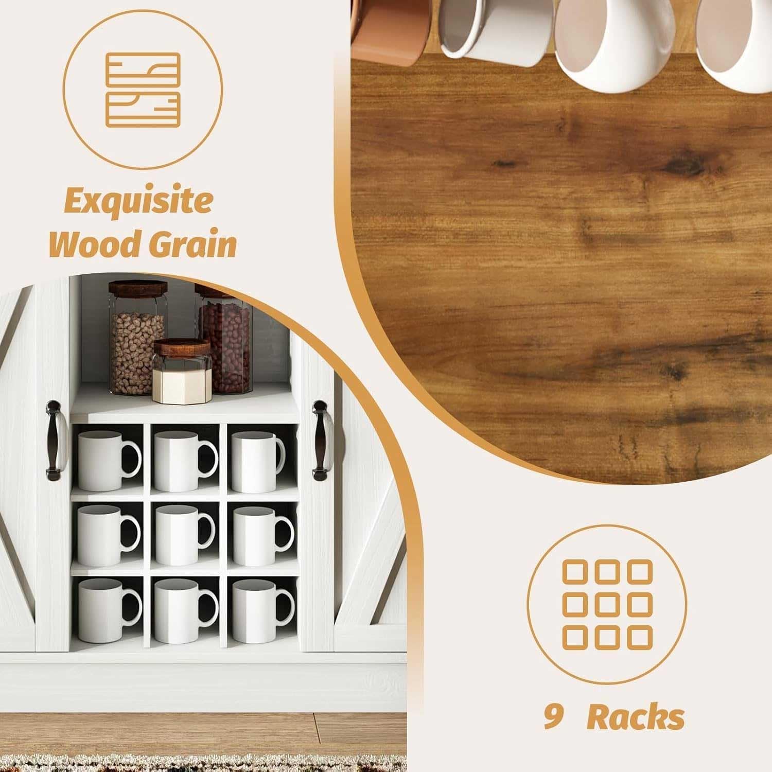 - FARMHOUSE WITH CLASSIC COFFEE BAR: The coffee bar with X design sliding barn door is easy to pull left and right, its design is classic and uncluttered. The coffee bar cabinets feature a white and yellow wood-grain color scheme for a farmhouse modern look