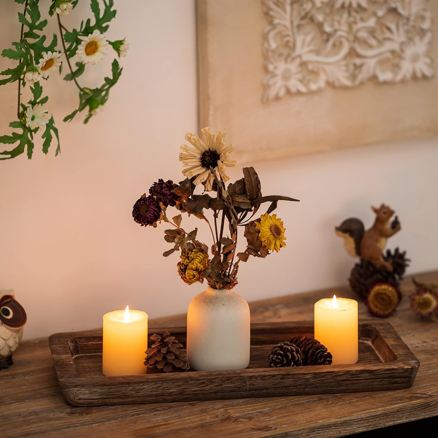 Hanobe Wooden Tray for Candle Decorative: Wood Rustic Long Centerpiece Trays Rectangle Narrow Farmhouse Decor for Dining Coffee Table Kitchen Fireplace Mantle