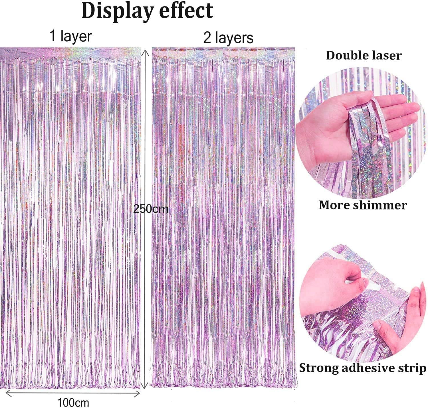 - 3.2 ft x 8.2 ft colorful foil fringe curtains. They are enough long and it cover just right for different events. Also enable to paired with Balloons and Banners and LED light curtains and Hanging Swirls Paper Fans and Pom Poms Flowers. It would make your party more impressive and compliments!