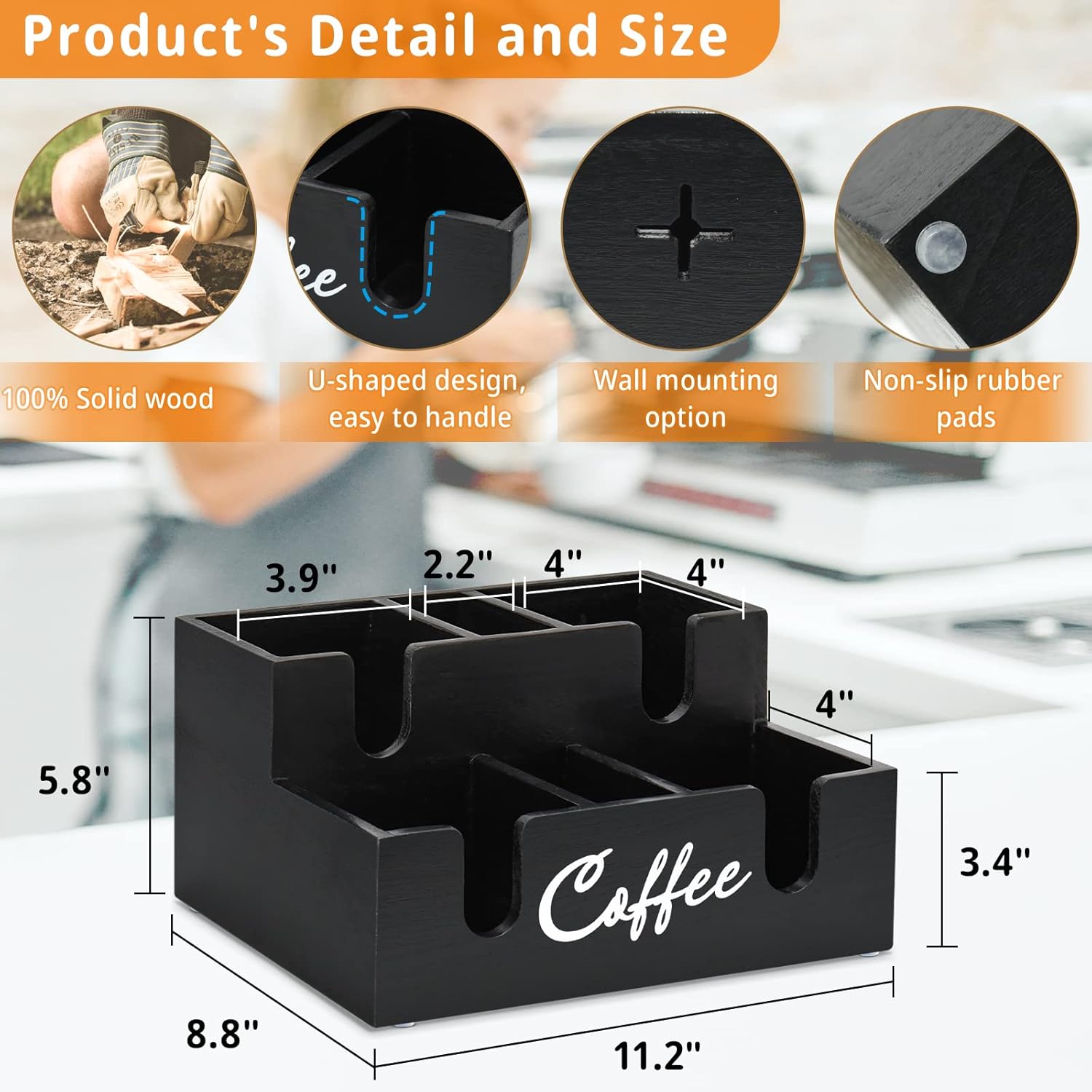 - ăDurable Coffee Bar Accessories and Organizeră: The Coffee Station Organizer Countertop is made of durable premium solid wood and can be used for a long time. The coffee cups, lids and straw storage box occupies the smallest space on the countertop and coffee table. The multifunctional coffee bar accessories is very easy to clean and take care of. Just wipe with a damp cloth to clean up the residue or liquid on the wooden coffee bar storage. For best results,please keep dry thoroughly.