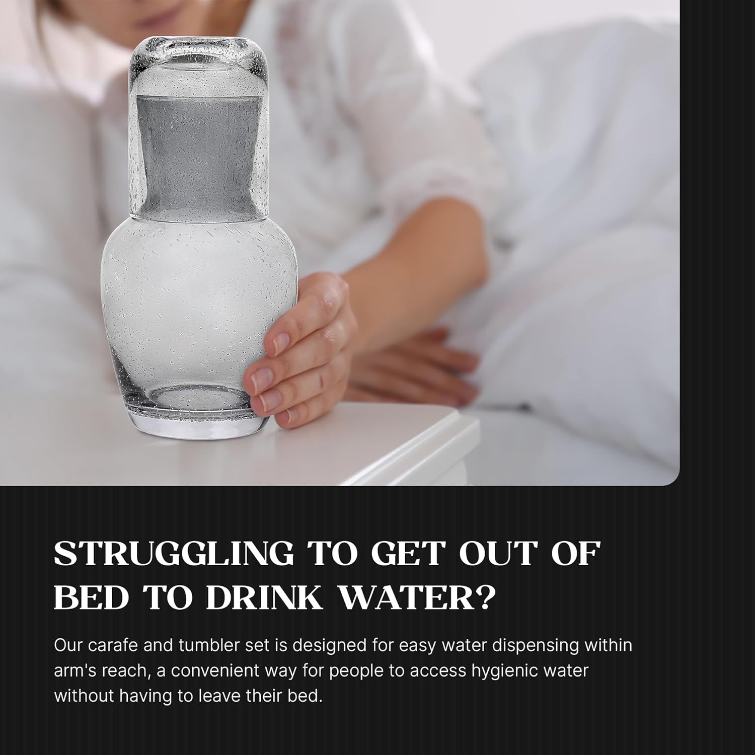 - 2-Piece Set: Expertly crafted of glass, this set includes a carafe with a tumbler that doubles as a lid to keep water or another liquid clean for drinking. It makes a great addition to a bedside table for quenching thirst in the middle of the night.