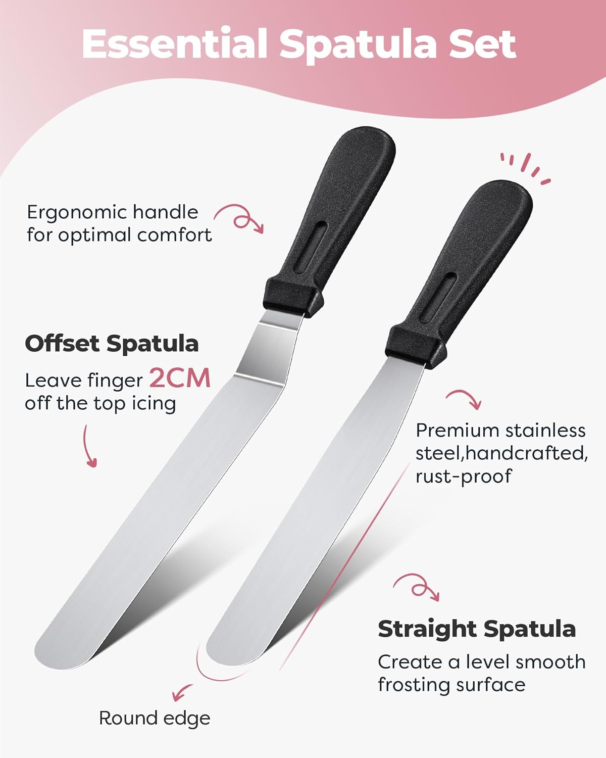 - Straight and Angled Frosting Spatulas: These high-quality stainless steel frosting spatulas make it easy to even out frosting and work on layered cakes. With a 12.5-inch angled spatula and a 10.6-inch straight spatula, you can create even crumb layers and perfect surfaces.