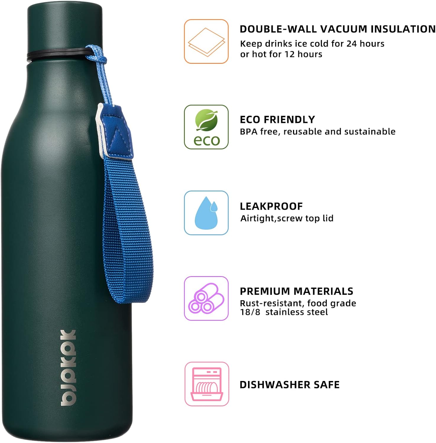 BJPKPK Insulated Water Bottles, 18 oz Stainless Steel Metal Water Bottle with Strap, BPA Free Leak Proof Thermos, Mugs, Flasks, Reusable Water Bottle for Sports & Travel, Army Green