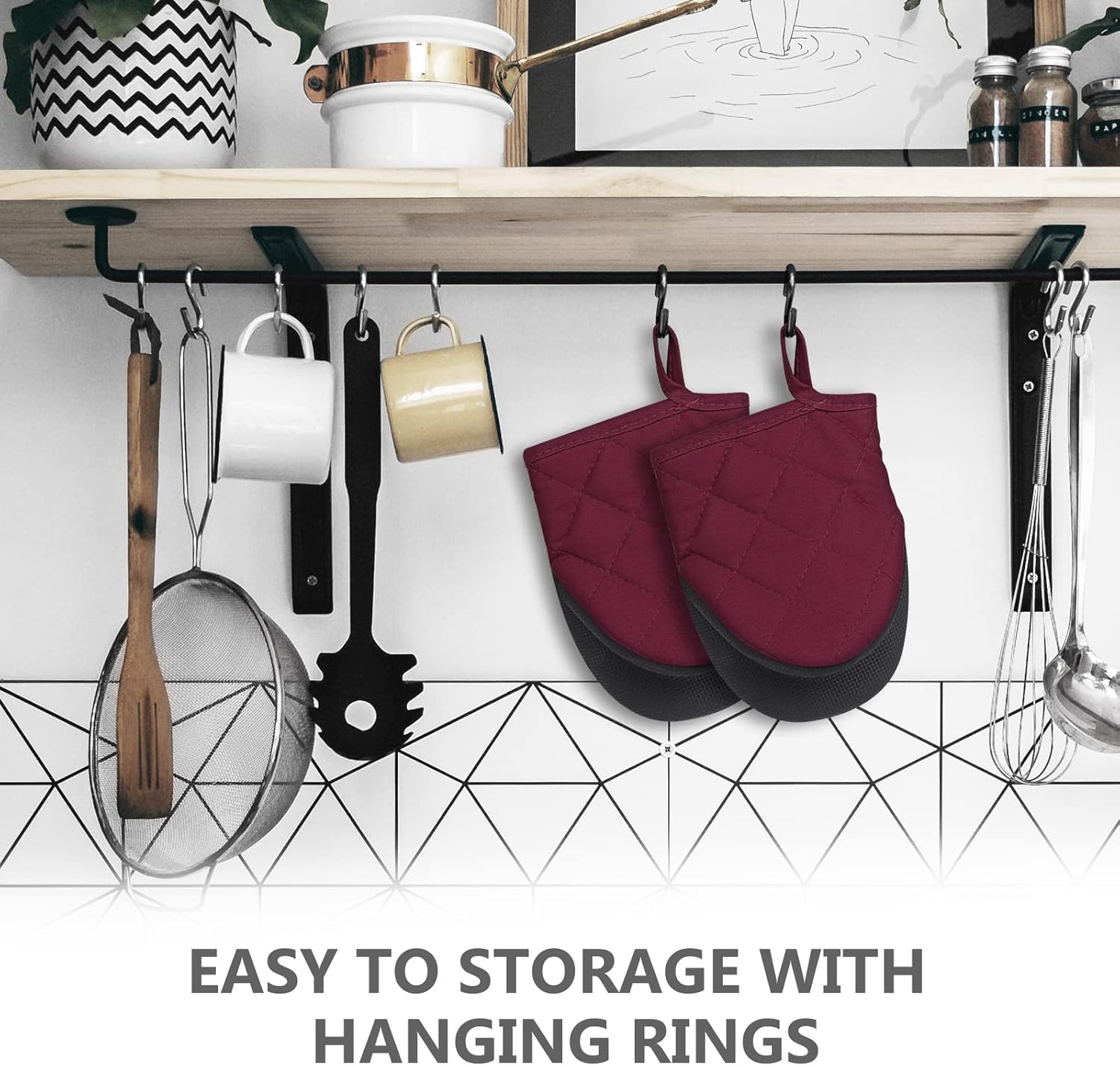 Qulable 1 Pair Short Oven Mitts - Silicone Kitchen Oven Gloves High Heat Resistant 500℉, Mini Oven Mits with Non-Slip Grip Surfaces and Hanging Loop for BBQ, Baking, Cooking and Grilling (Dark Red)