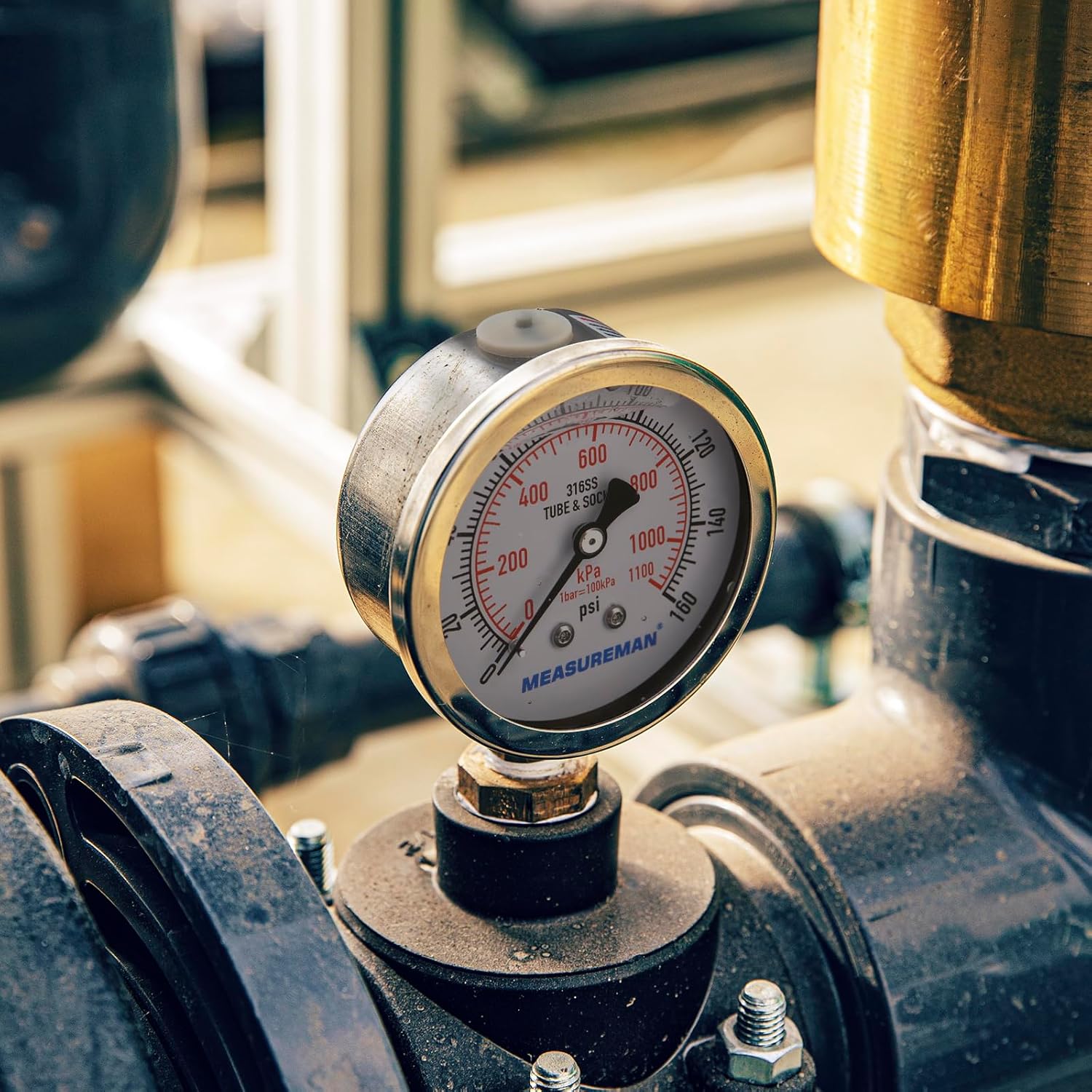 MEASUREMAN Fully Stainless Steel Hydraulic Glycerin Filled Pressure Gauge, 2-1/2" Dial Size,0-160psi/kpa,1/4" NPT Lower Mount
