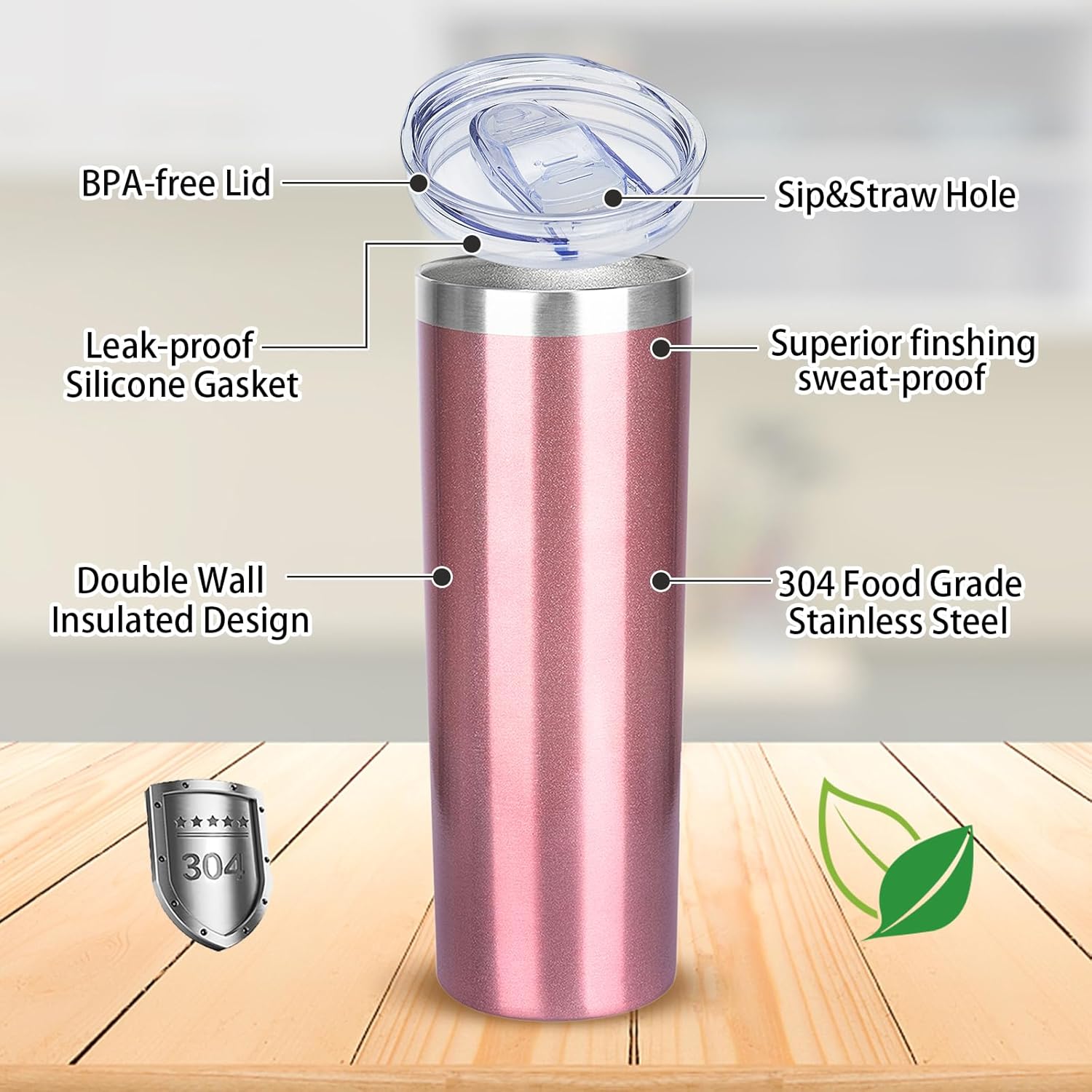 20 oz Skinny Tumblers with Lid and Straw,Stainless Steel Vacuum Insulated Tumbler Cup Double Wall Travel Coffee Mug, Thermal Water Tumbler for Hot and Cold Drinks(Rose Gold,4)