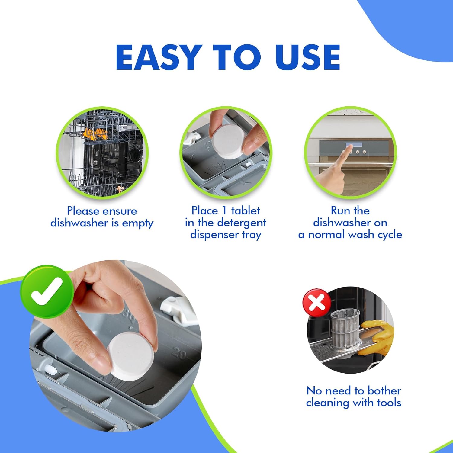 - [MONTHLY MAINTENANCE] Keep your dishwasher clean with the xcleen dishwasher cleaning tablet. Use a single or 2 care tablets per month. Place tablets in an empty dishwasher to restore cleanliness to the machine. You can use it for at least a year or more.