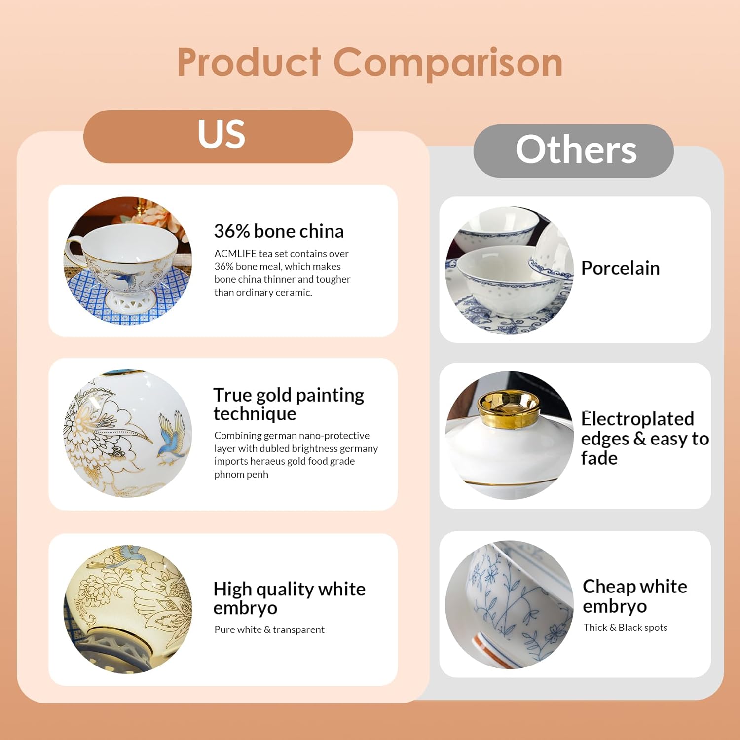 - Healthy Bone China Tea Set: Our english set is different from ordinary porcelain tea sets. This vintage tea sets for adults contain more than 40% bone meal, which are higher-end cup and saucer set on the market. ACMLIFE blue tea sets is made of lead-free bone china material fired at high temperature, not only the surface is smooth and delicate and easy to clean, but also very lightweight.