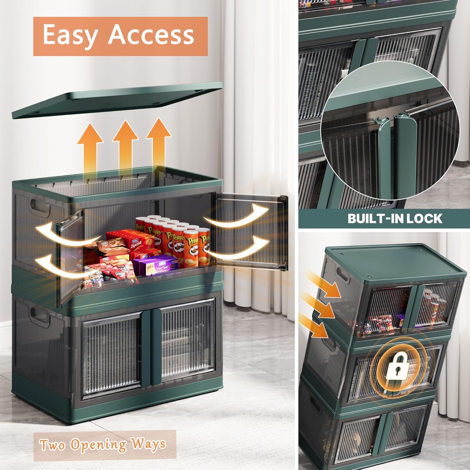 19Gal Collapsible Storage Bins with Lids & Wheels - 2 Pack Stackable with Doors, Heavy-Duty Plastic Containers for Home/Office, Green