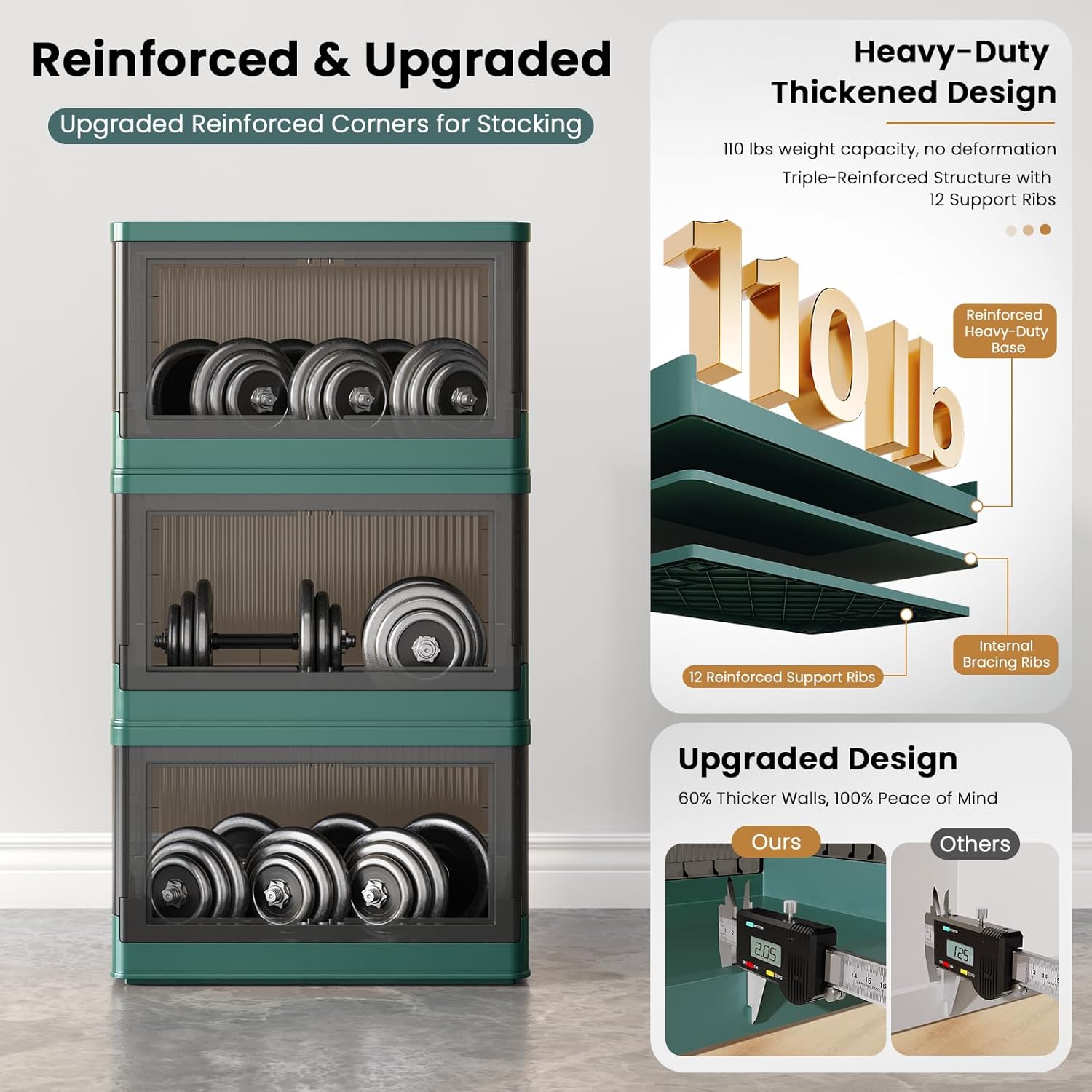 8.4Gal Collapsible Storage Bins with Lids & Wheels - 2 Pack Stackable with Doors, Heavy-Duty Plastic Containers for Home/Office, Green
