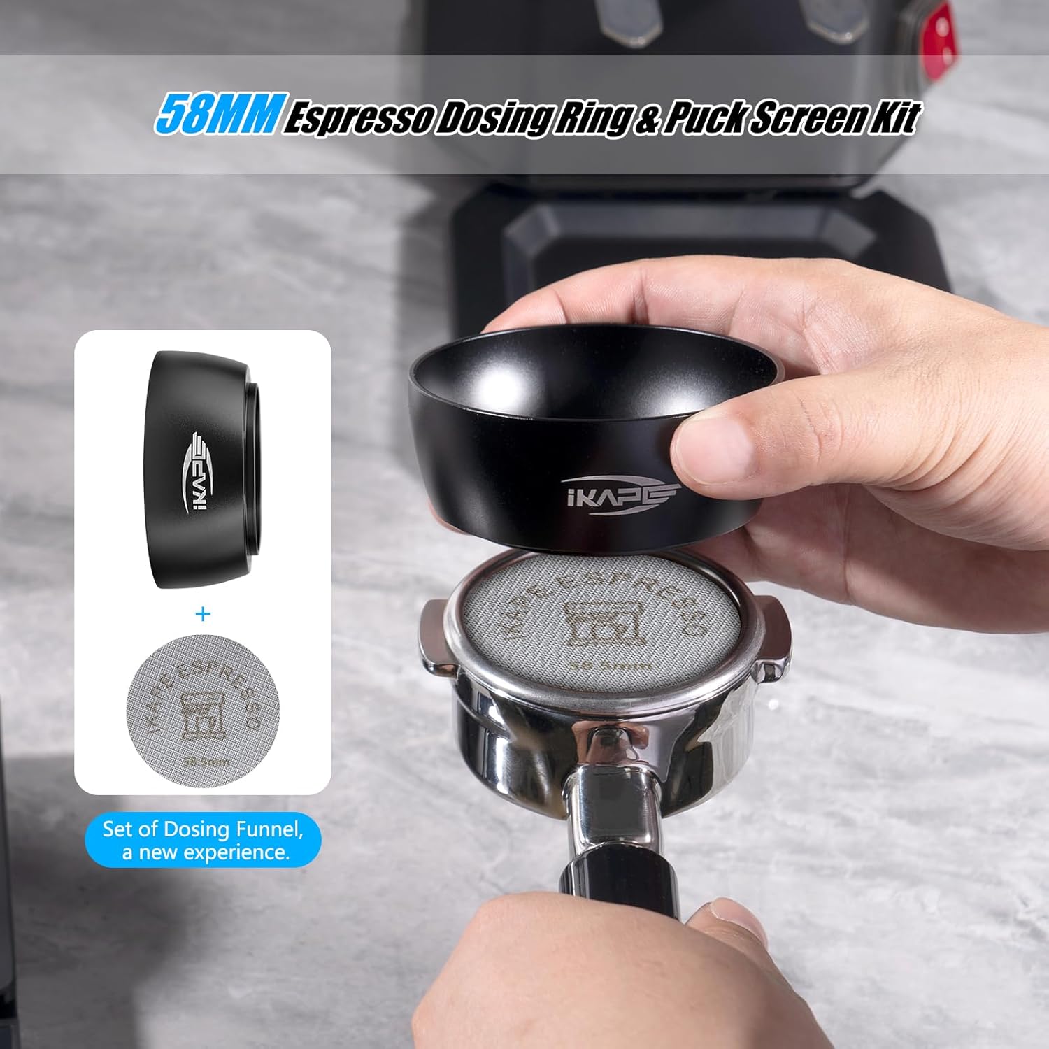- Magnetic Dosing Funnel & Puck Screen Kit - Coming with a dosing funnel 58mm magnetic Dosing ring with ten evenly distributed magnets, with strong adsorption force, can steadily magnetic portafilter basket. In addition, it also comes with a 58.5mm espresso puck screen. Place them on the portafilter basket, and you can make delicious espresso