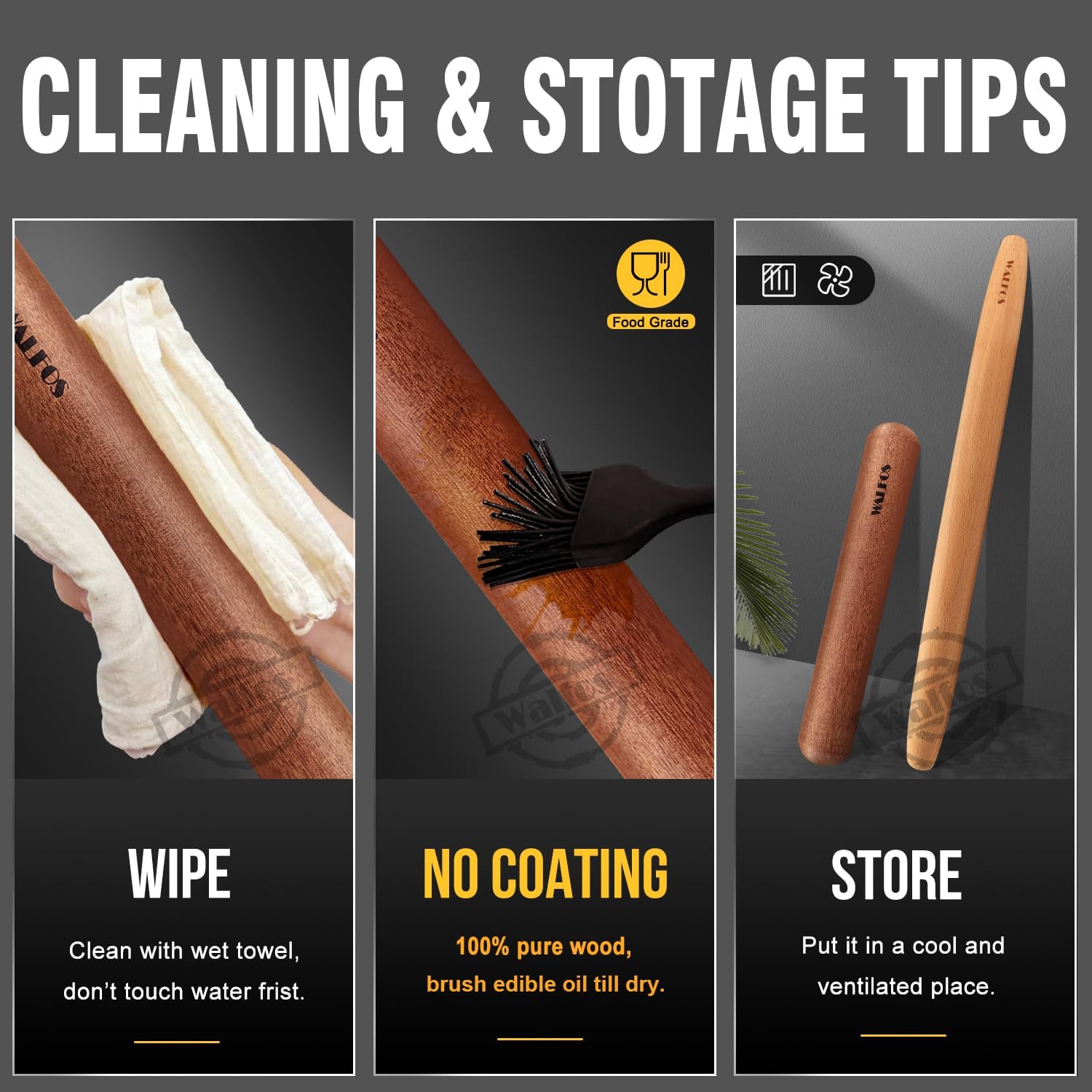 - 【EASY CLEANING & STORING】 - Natural non-stick wood pizza rolling pin set, you just need a towel to wipe it and brush edible oil till dry, store it in a cool and ventilated place to avoid mould. Note: Do not place in dishwasher or soak in water.