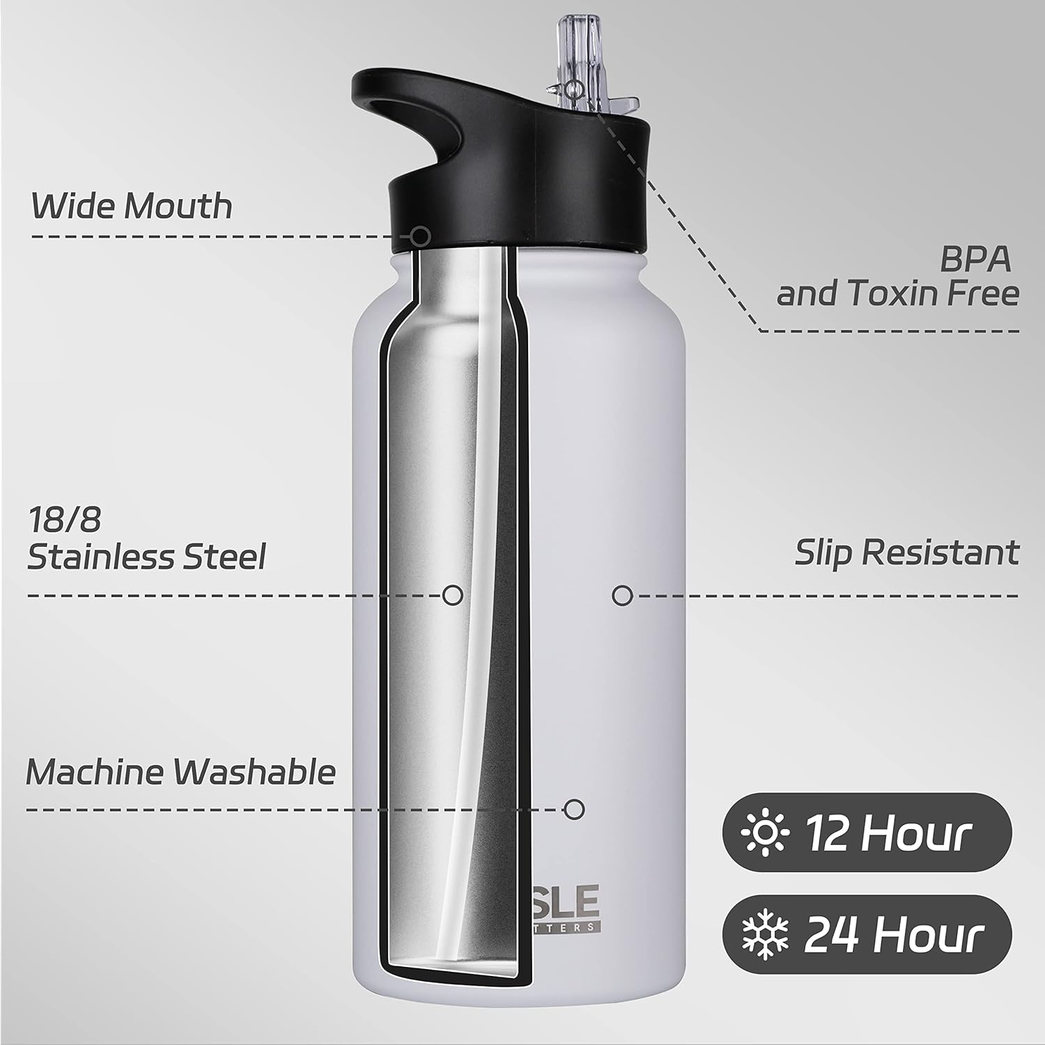 HASLE OUTFITTERS 32 oz Insulated Water Bottle Stainless Steel Double Walled Vacuum Sports Water Bottle with 2 Lids (Straw and Spout Lid) for Gym Camping Hiking(White,4)