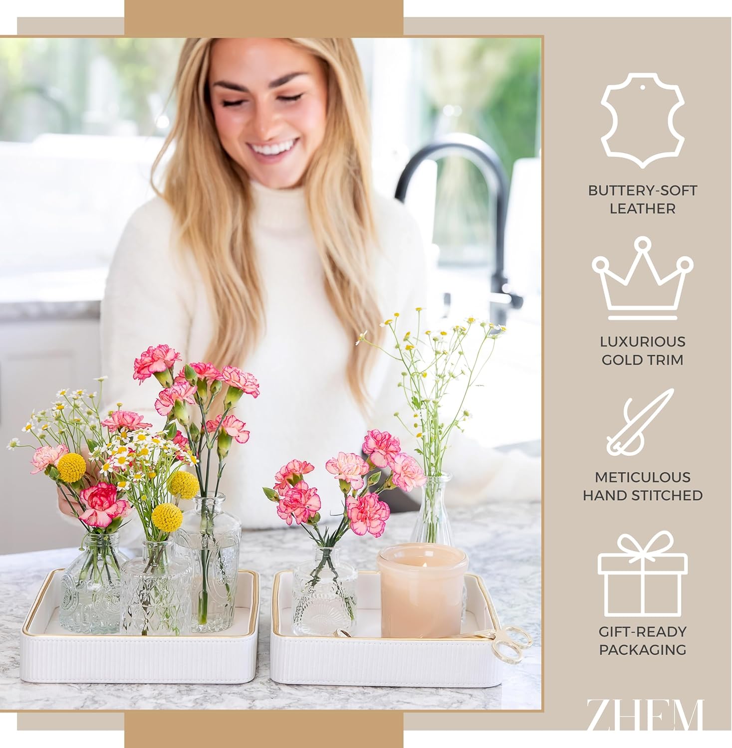 - 🎁 Melds with Your Interior Decor: Offered in timeless white and gray colors, our dump tray embraces versatility; This decorative vanity tray for nightstand, sleek gold trim desk organizer, stylish vanity trays for bedroom dresser, and elegant tray for dresser top will slip effortlessly into your existing home, adding a touch of refinement that complements your style. Whenever you consider upgrading your bedside decor, a decorative vanity tray, keys tray, or tray for keys, ZHEM brand is an excellent choice for you.