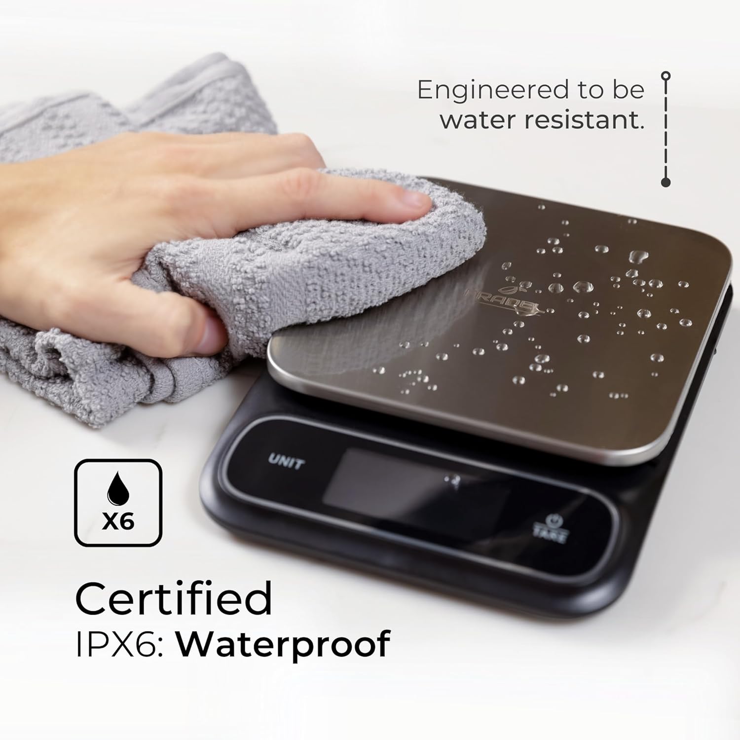 - A Kitchen Must Have: Our waterproof digital food scale ensures high-precision readings with 0.1g / .01 oz accuracy. It converts to g, lb:oz, fl:oz, and ml, making it the ideal food weight scale.