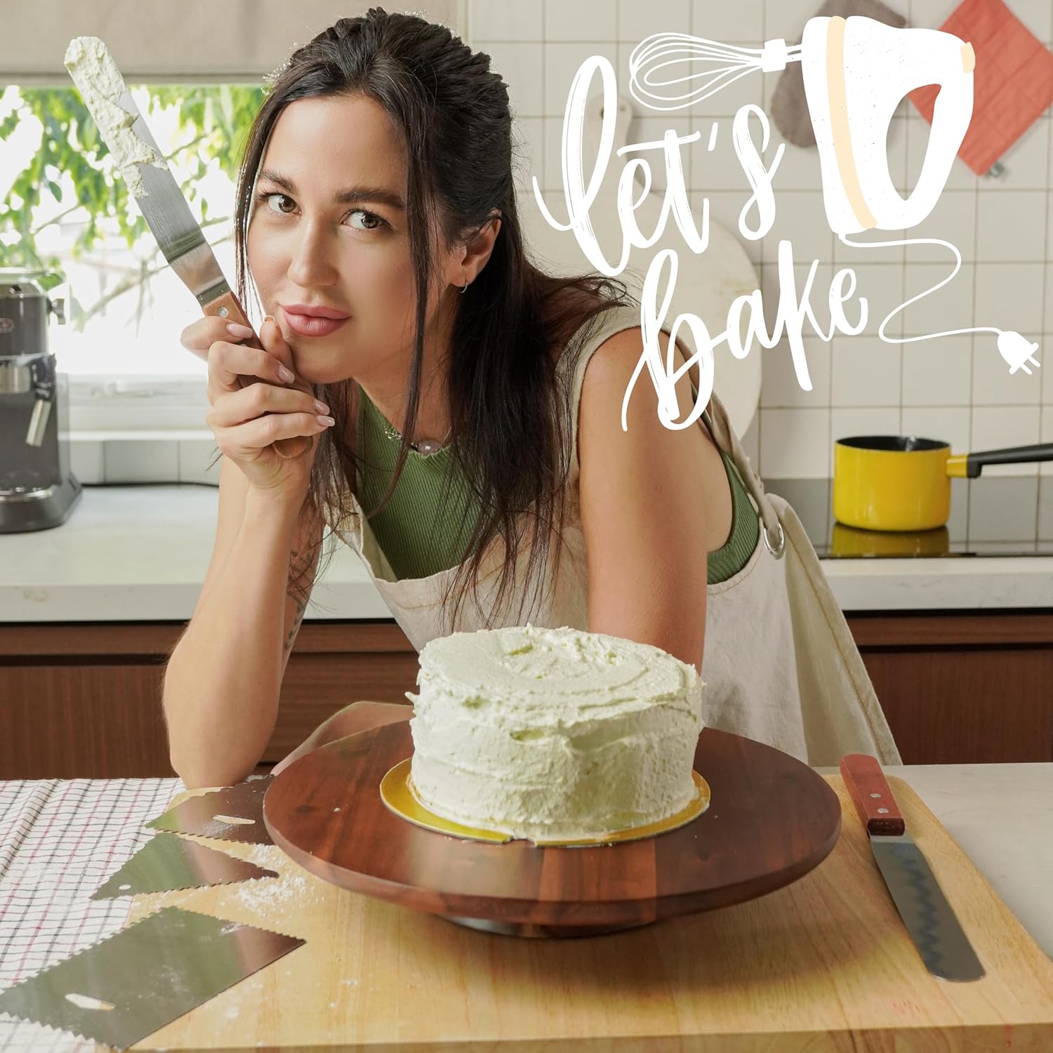 - Complete Cake Decorating Supplies: Includes an Acacia wood rotating cake stand, 2 icing spatulas, and 3 comb icing smoothers, making it easy to create unique patterns on cakes or cupcakes