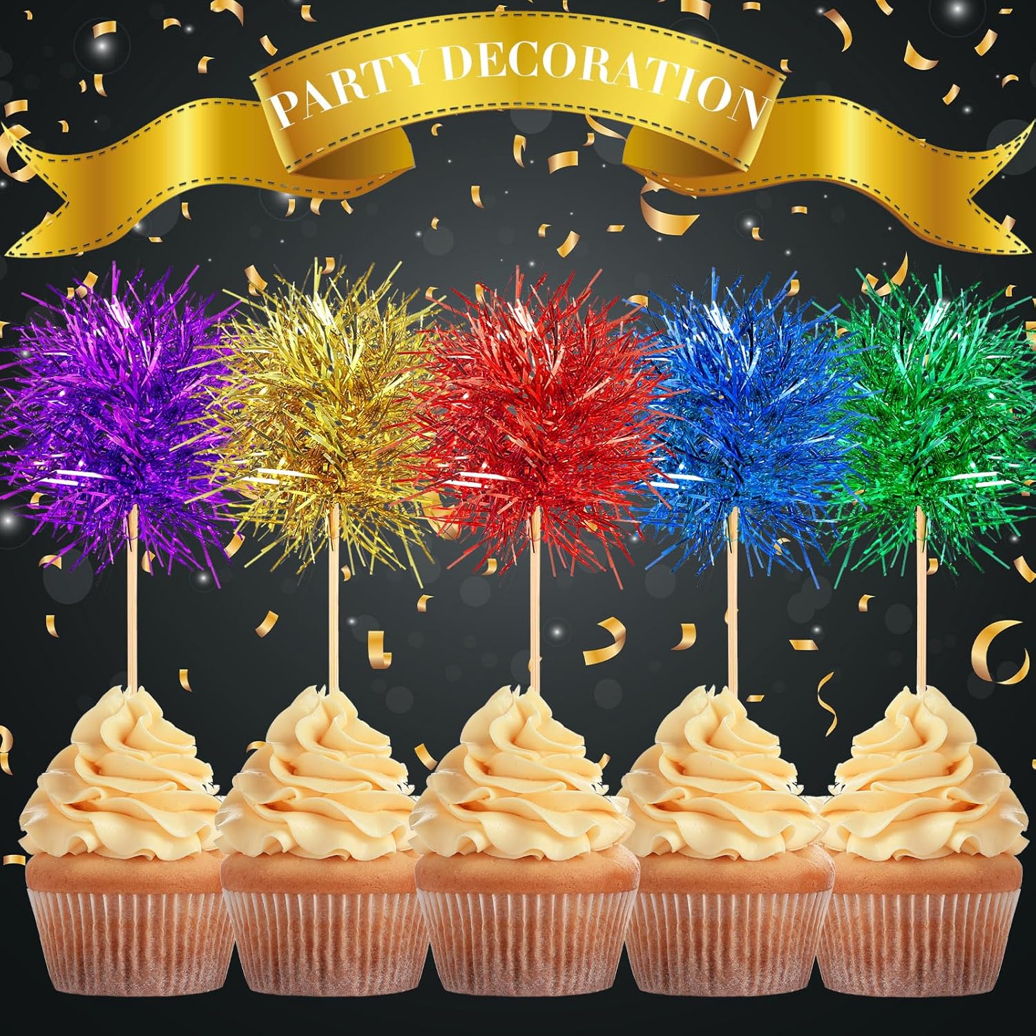 Chinco 100 Pcs Foil Firework Cupcake Toppers Sparkle Tinsel Cake Toppers Cake Decoration Cocktail Fruit Toothpick for Birthday Wedding Graduation Party(Bright Color)