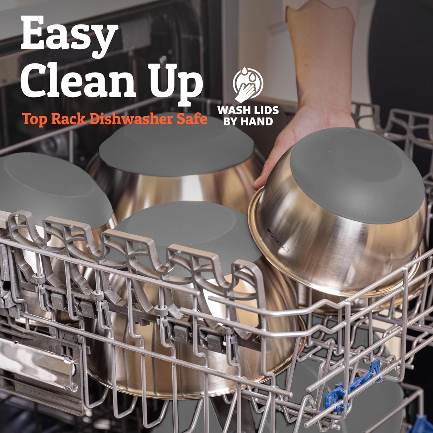 - DISHWASHER SAFE - Save time with the clean up too, this premium stainless steel bowl set is also top rack dishwasher safe [wash lids by hand].