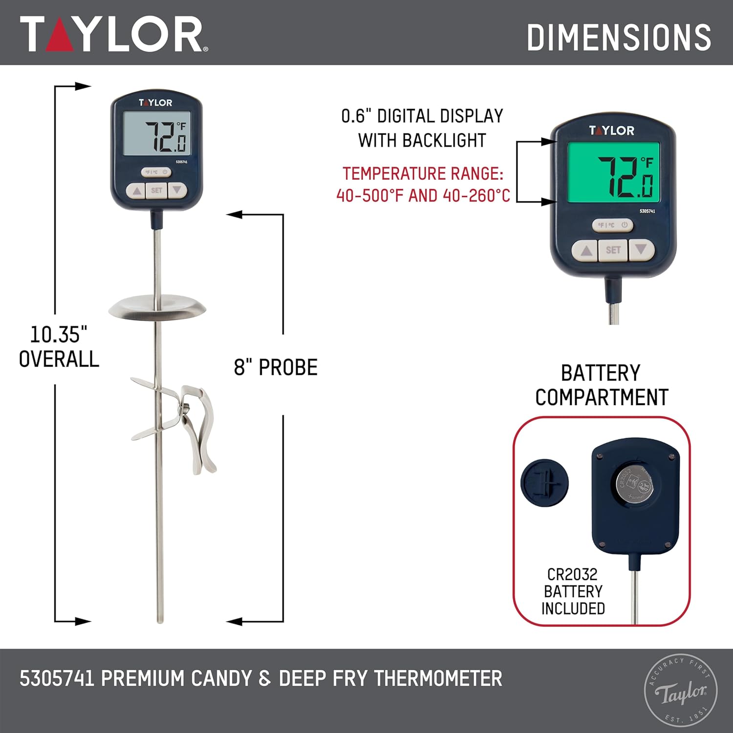 Taylor Digital Premium High Heat Resistant Candy Thermometer, Meat, Deep Fry, Brewing, and Craft Thermometer, with pan/Kettle Clip and Heat Shield, Backlit Display, and Includes 1 CR2032 Battery, Navy