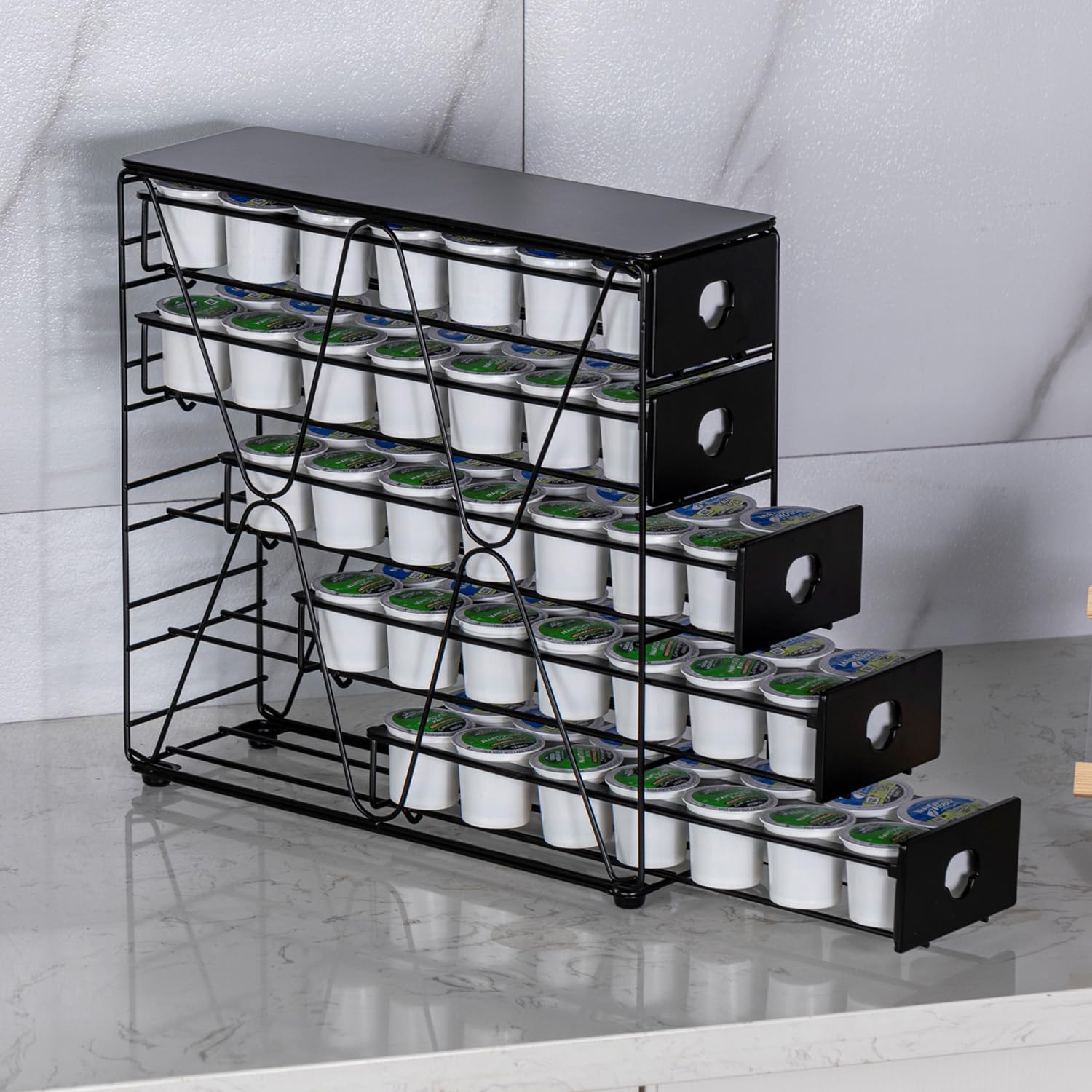 - 【2023 New Design】Modern design of multi-layer pod Holder keeps your capsules neat and tidy and your counter clean.Find your favorite coffee flavor quickly and easily with the tiered system. You can place mugs and accessories on top of the drawers to have everything in one spot you may need.