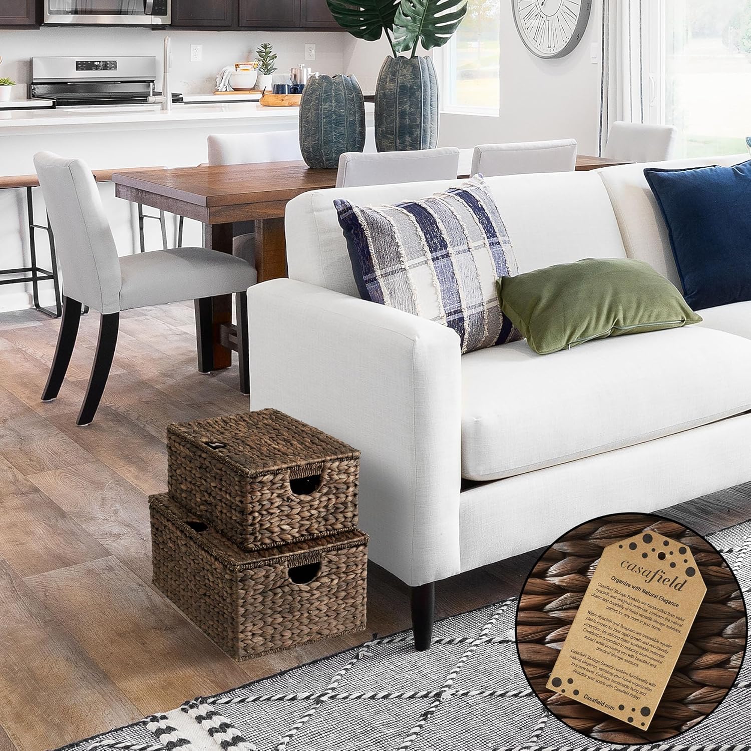- Set of 2 storage baskets: Casafield's stackable storage baskets arrive in two sizes: medium and large. Each rectangular basket is handwoven with 100% natural water hyacinth over a sturdy metal frame and features an appealing textured finish.