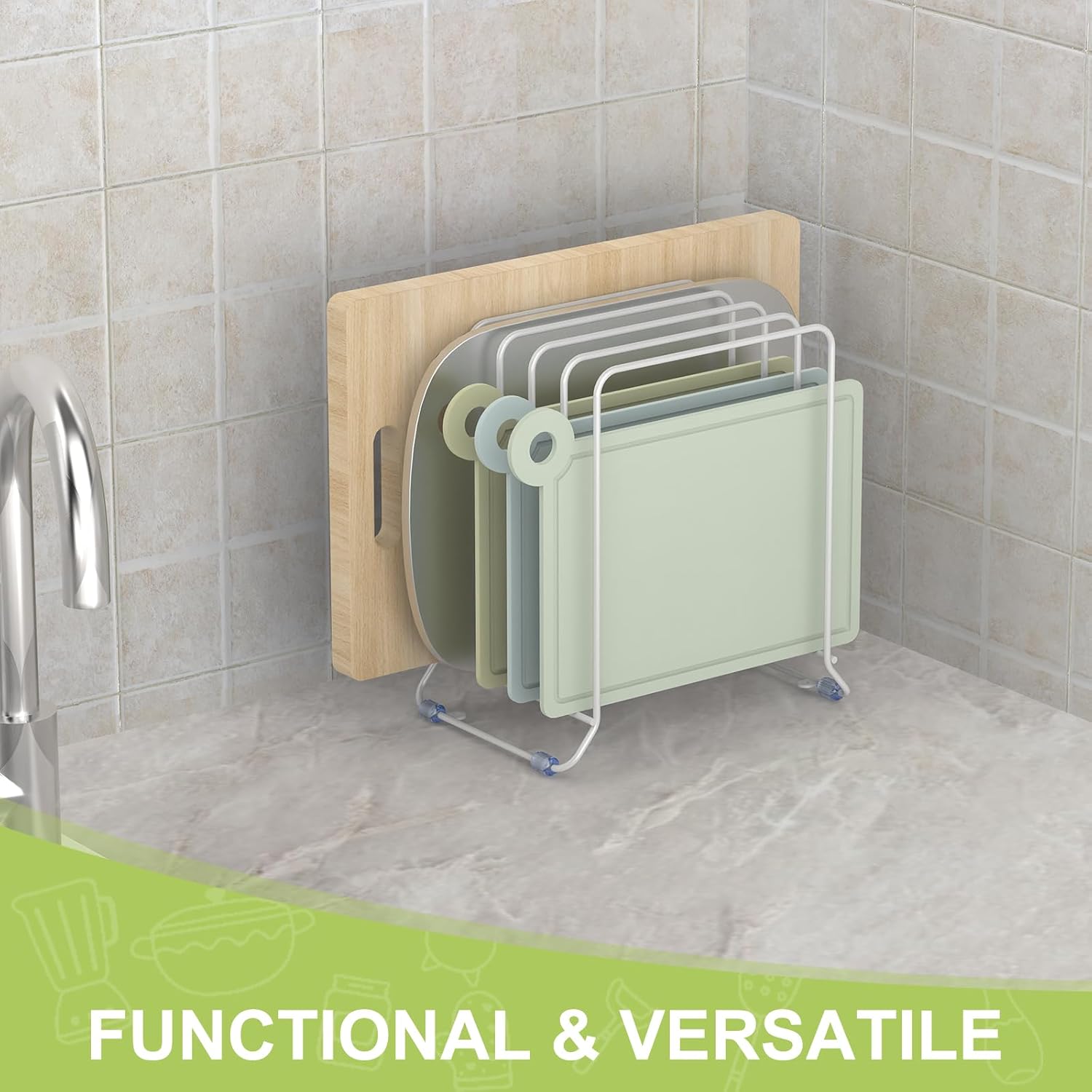 - 【SPACE SAVER】 This cutting board organizer can be put either on your kitchen countertop for daily use or in cabinet to organize to organize cutting boards and bakeware, keep everything organized and tidy, saving valuable kitchen space.
