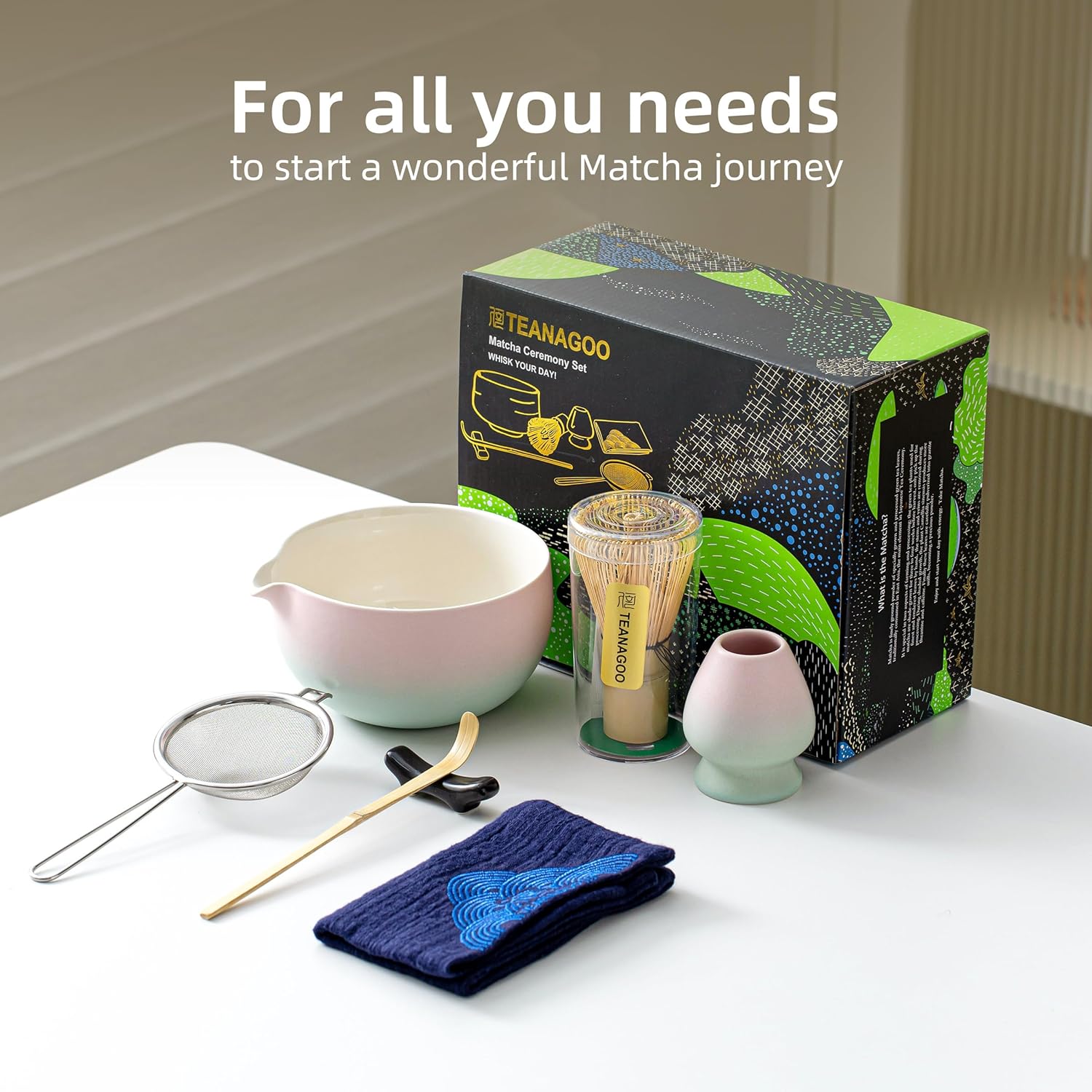 - 7-PCS MATCHA WHISK SET: 1*Ceramic Bowl (chawan) 510 Ml/18 Oz, 1*Bamboo Whisk, 1*Bamboo Scoop (chashaku), 1*Cermaic Whisk Holder, 1*Ceramic Scoop Stand, 1*Cotton Tea Cloth (chakin), 1*Matcha Powder Sifter.includes All Accessories