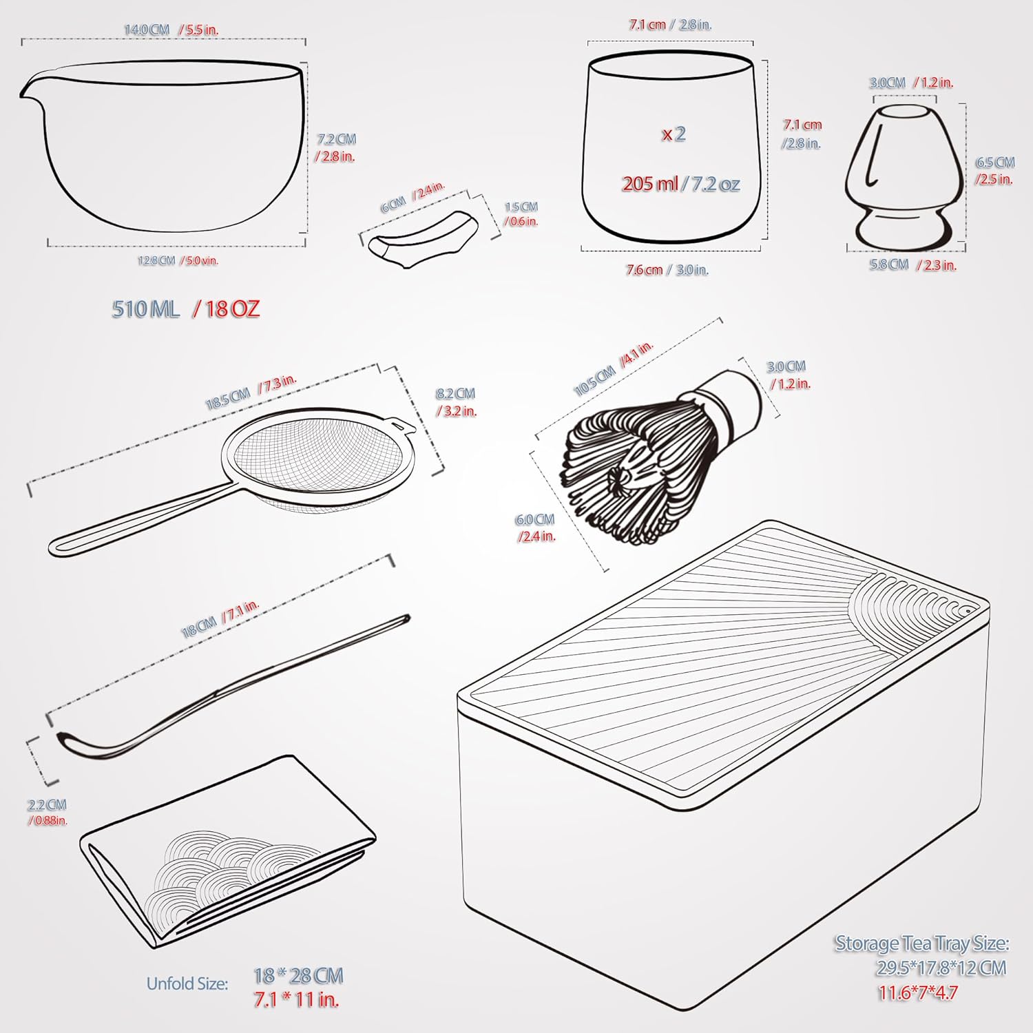 - 10-PCS MATCHA WHISK SET:1* Bamboo Whisk, 1* Bamboo Scoop (Chashaku), 1*Ceramic Bowl (Chawan) 510 ml/18 oz, 2* Ceramic Cups(7.2oz), 1* Cermaic Whisk Holder. 1* Ceramic Scoop Stand, 1* Cotton Tea Cloth (Chakin), 1* Matcha Powder Sifter, 1* Matcha Hand-Book ( 16 colorful pages) ,1* Multi-funcation Tea Tray, 1* Imitation Leather Travel Bag. .includes All Accessories