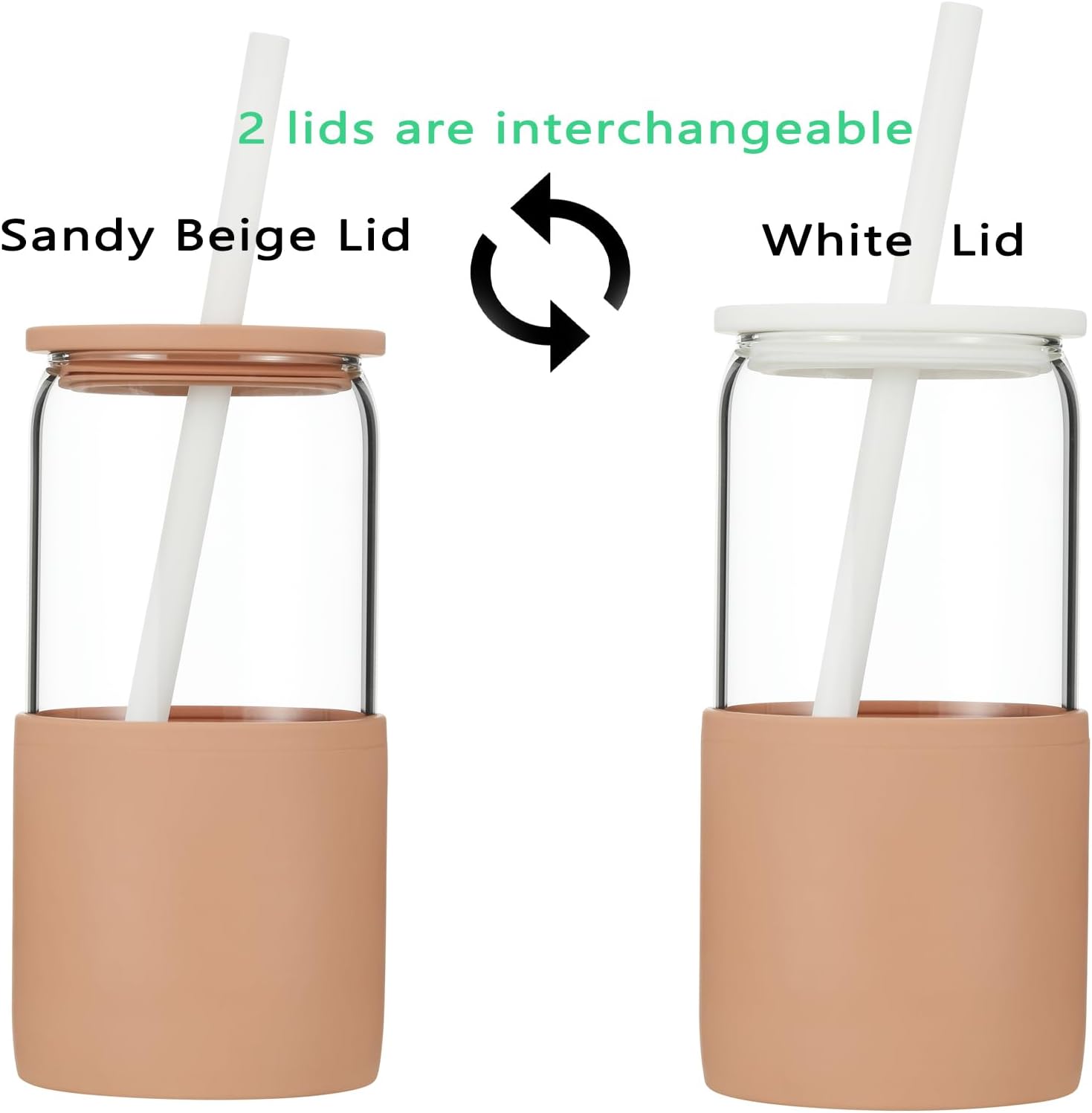 - The two colored silicone lids are interchangeable. This set contains one borosilicate glass cup, one sandy beige silicone sleeve, one white silicone lid, one sandy beige lid, two white silicone straws, one straw cleaner brush.