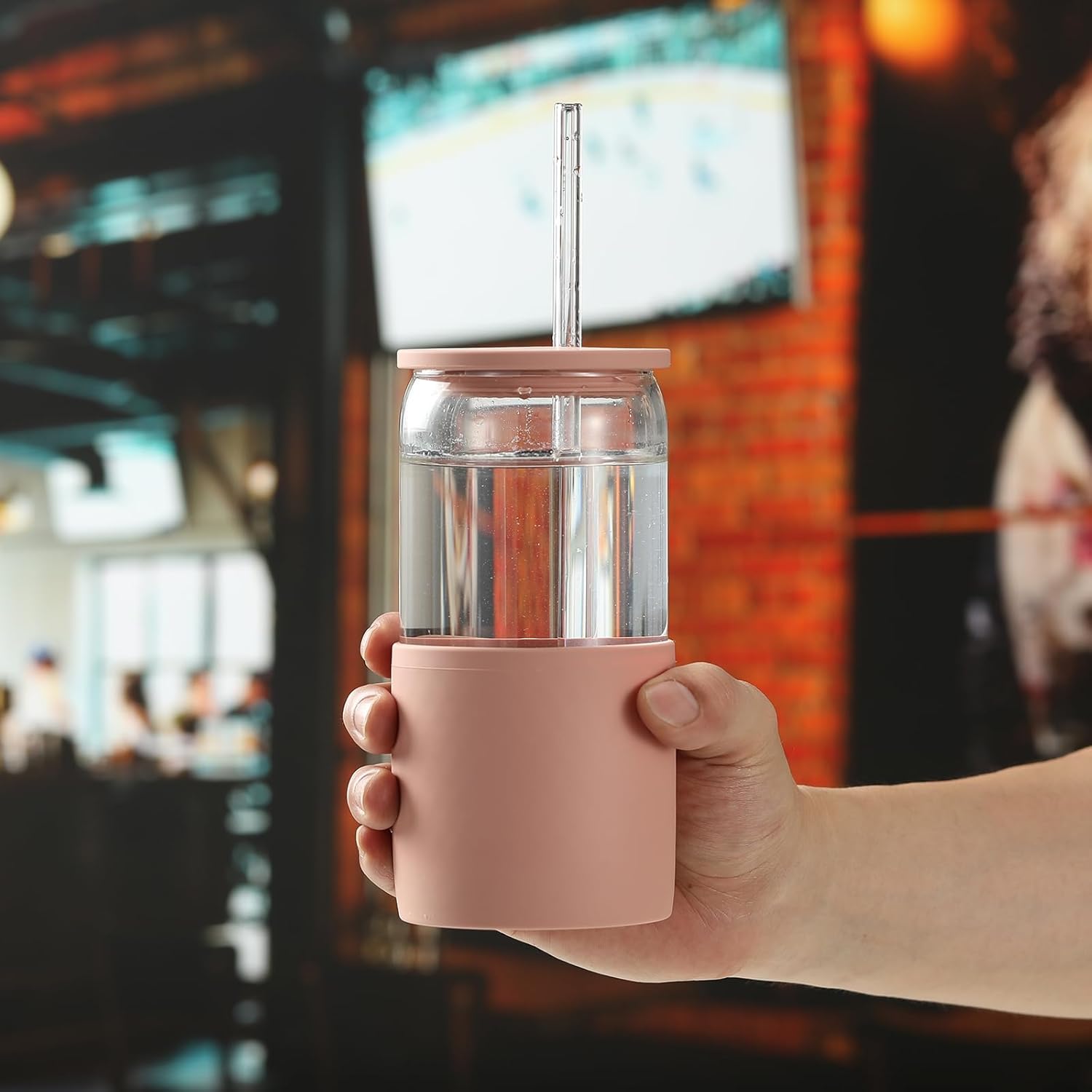 Sunseeke Glass Tumbler with Straw and Lid, 16oz Ice Coffee Cup, Silicone Sleeve Cleaning Brushes, Drinking Glasses for Water, Iced Coffee, Smoothie - BPA Free (Sandy Beige)