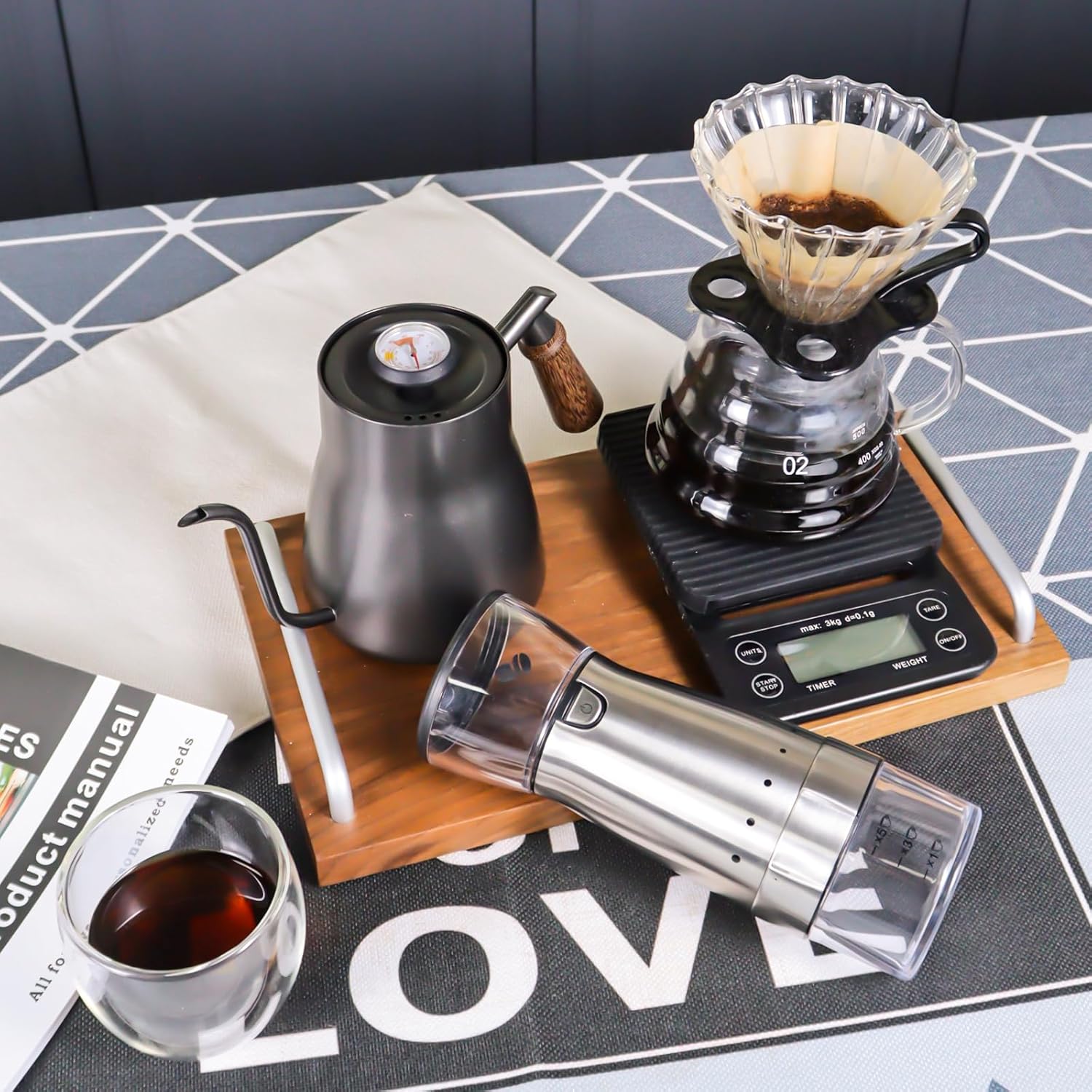 - âThe electric coffee grinder ensures freshly ground beans at all times, and the pour-over kettle allows for precise and controlled pouring. With this set, you can enjoy the best coffee in nature.