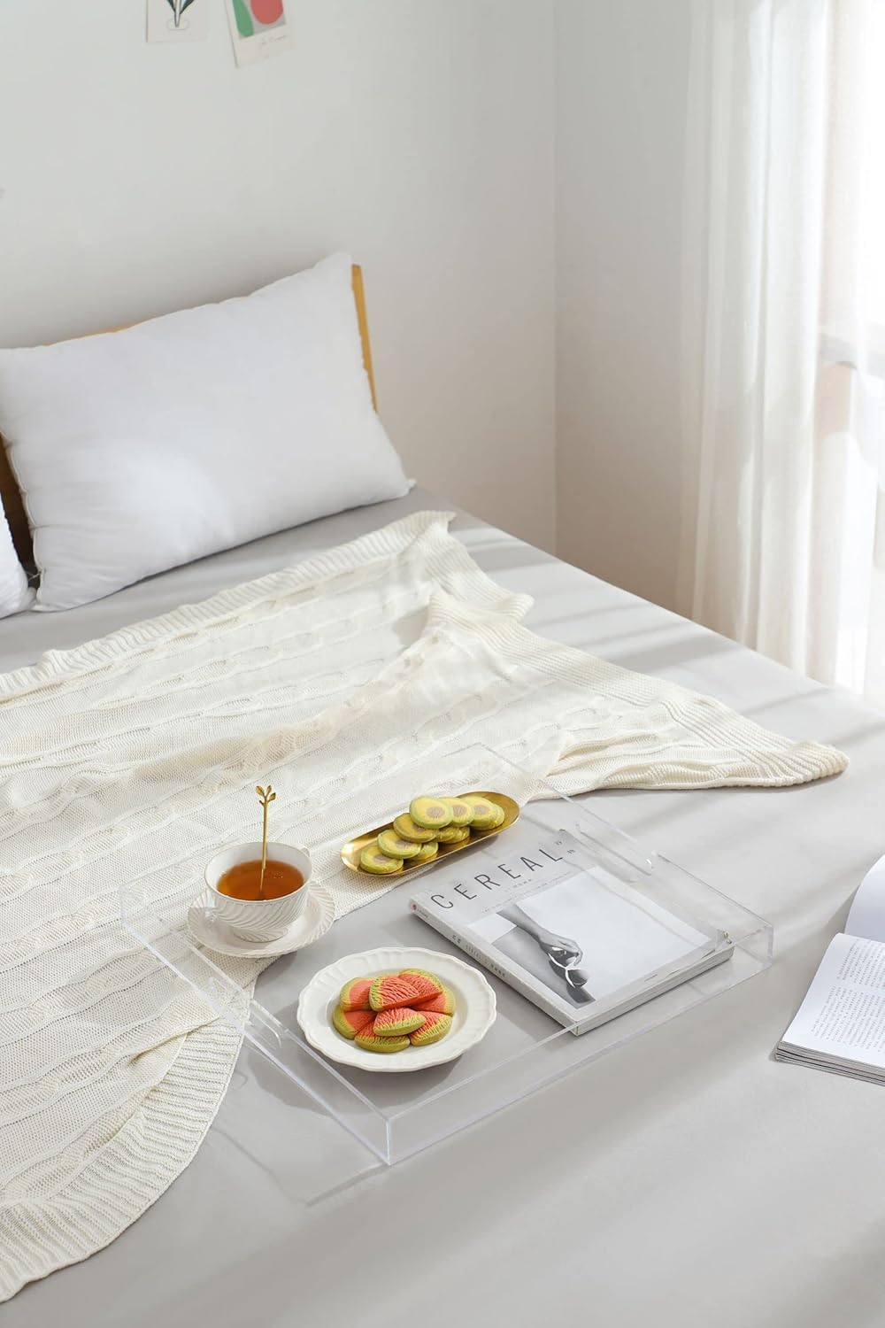 - MULTI-PURPOSE: This Clear Acrylic Serving Tray is a multi-purpose necessity for any home and an ideal decorative companion for your ottoman and coffee table. With handles on the side,the tray is easier for serving meals,snacks,offee,drinks,desserts,serving breakfast in bed, arranging toiletries and cosmetics on a bathroom vanity, storing remote controls in the living room, and turning your sofa into a cozy workstation.