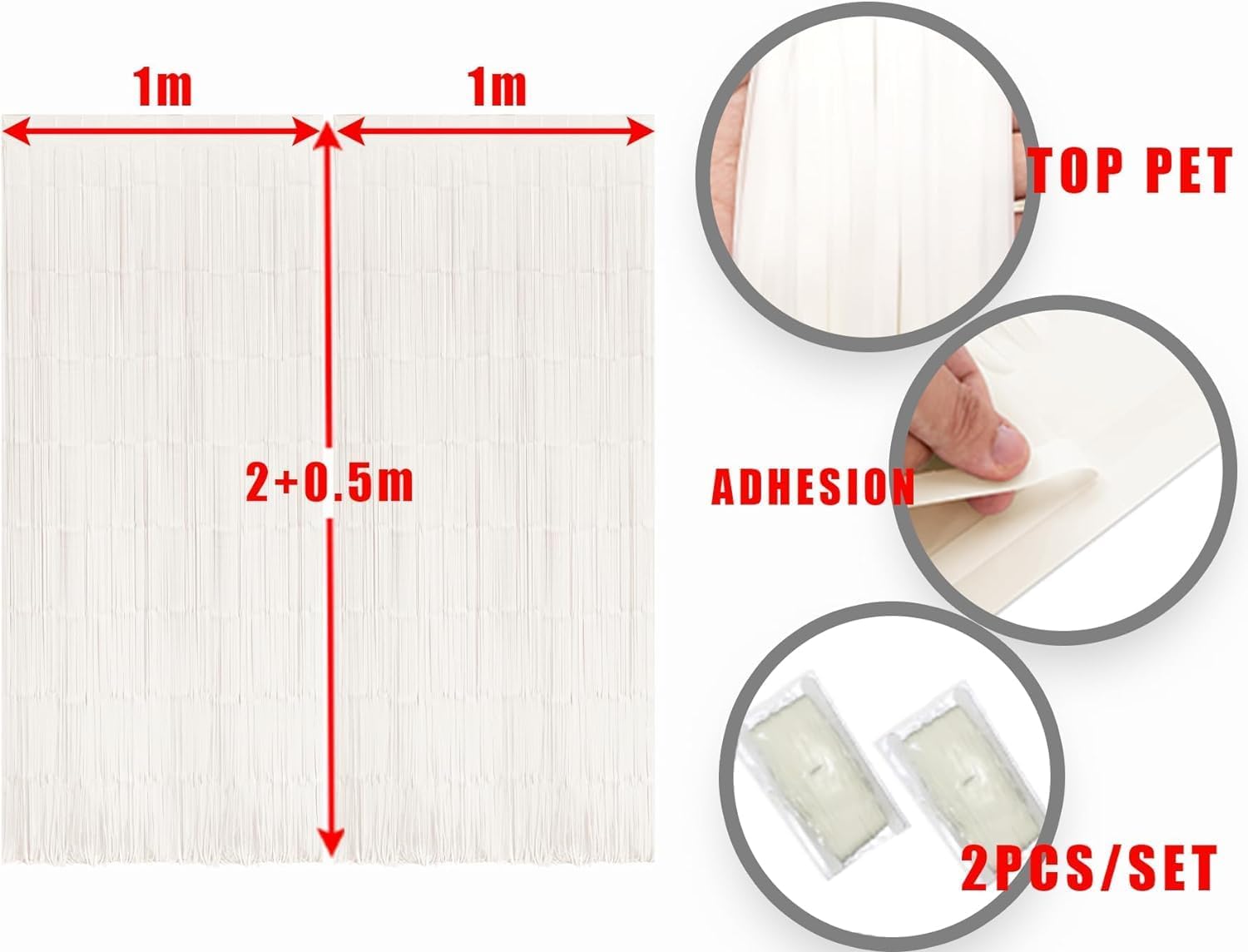 - The top of white foil fringe curtain is covered with double-sided adhesive tape, eliminating the need for push pins or tacks that could damage walls. Perfectly stay in place for the duration of indoor or outdoor party decorations.