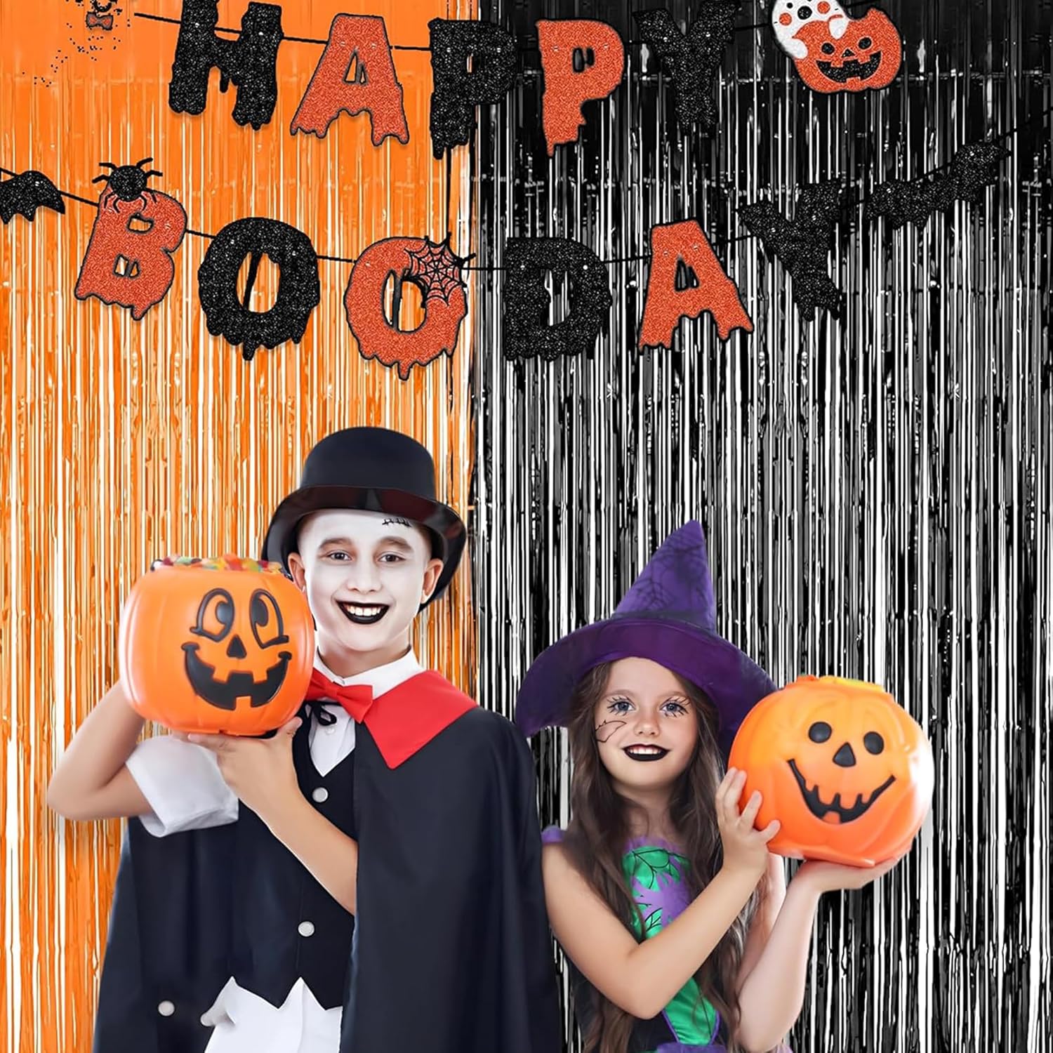 BRAVESHINE 1 Black 1 Orange Tinsel Photo Backdrop Curtains - 3.2x8.2ft Foil Fringe Streamer Curtain for Birthdays, Halloweens, Graduations, Pumpkin, Home, Indoor or Outdoor Party Supplies Decorations