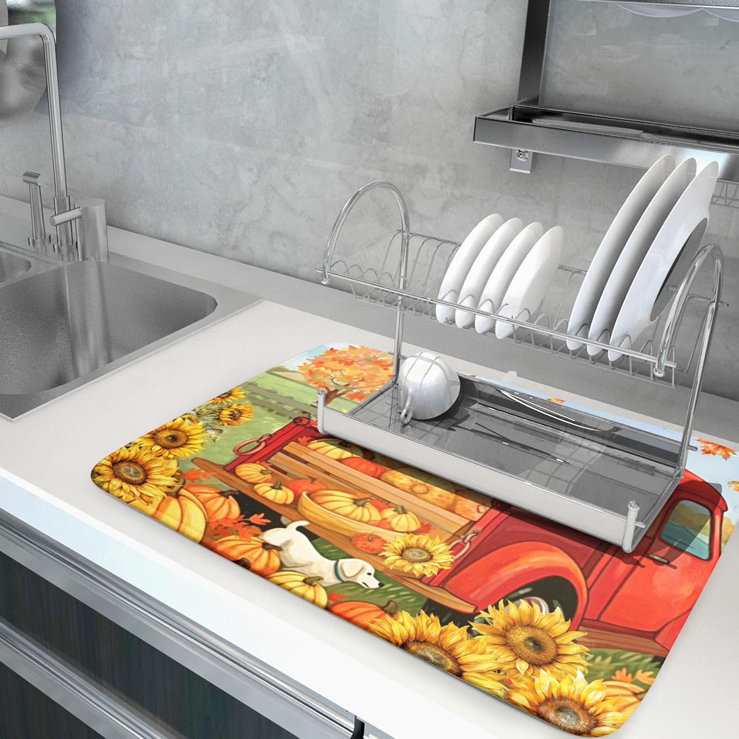 Autumn Pumpkin Red Truck Dish Drying Mat for Kitchen Counter,Fall Leaves Sunflower Cue Dog Harvest Drying Mat 18 x 24 Inch Microfiber Dish Drying Pad Dish Rack Drainer Mat for Coffee Bar