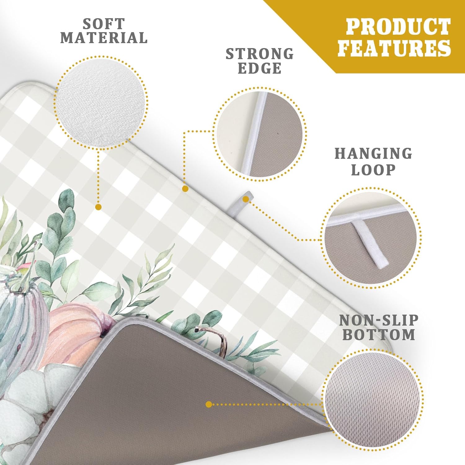 Fall Colorful Pumpkin Dish Drying Mat for Kitchen Counter,Green Leaves Drying Mat with Hanging Loop 18 x 24 Inch Microfiber Grey White Check Plaids Dish Drying Pad Dish Rack Drainer Mat for Coffee Bar