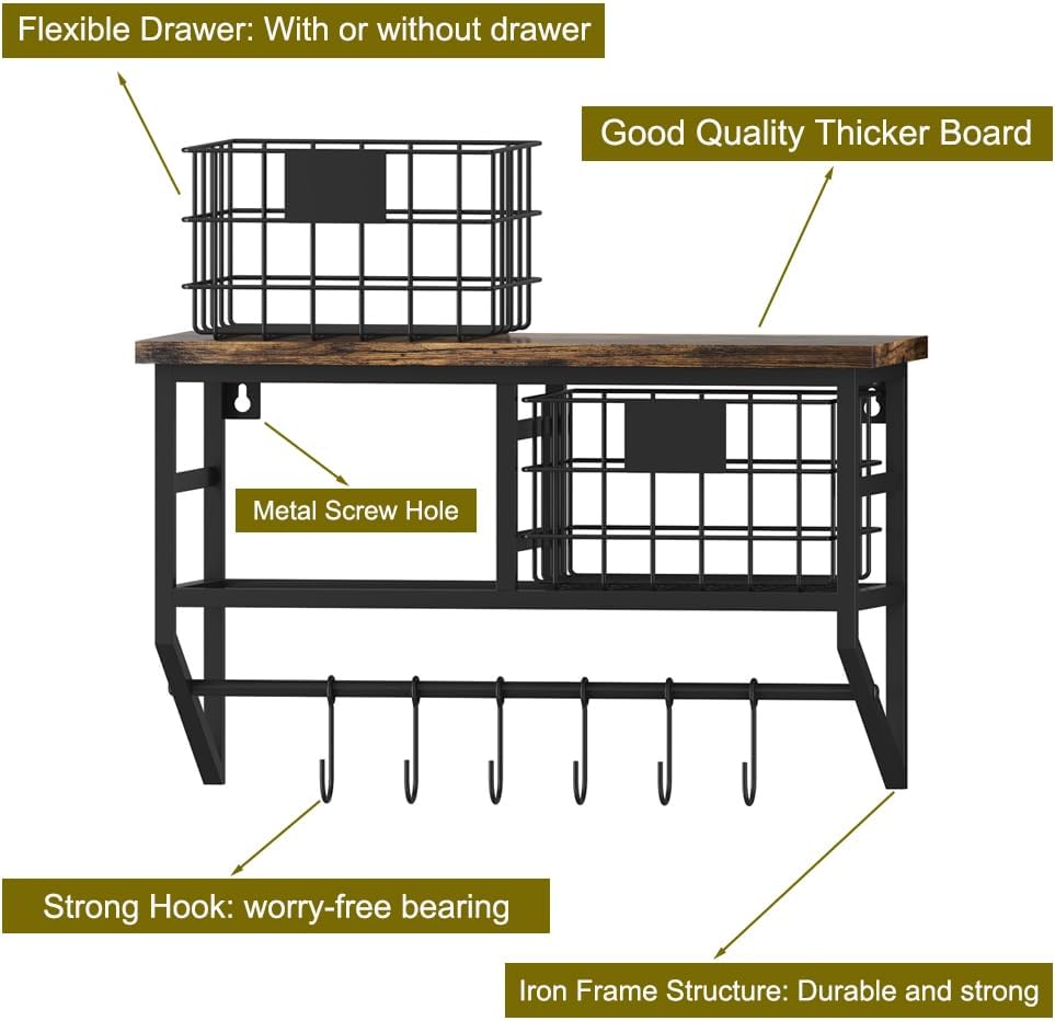 - ăSave SpaceăThis 16in wood floating shelves with baskets is a charming decoration, will not occupy much place of the home. On the contrary, this wall storage organizer will create more storage space for you, can be combined with the fitment style of the home and placed in many venues like kitchens, bathroom, farmhouse and bars, garage, above toilet etc, any other where you want to install, Perfectly saves you space.