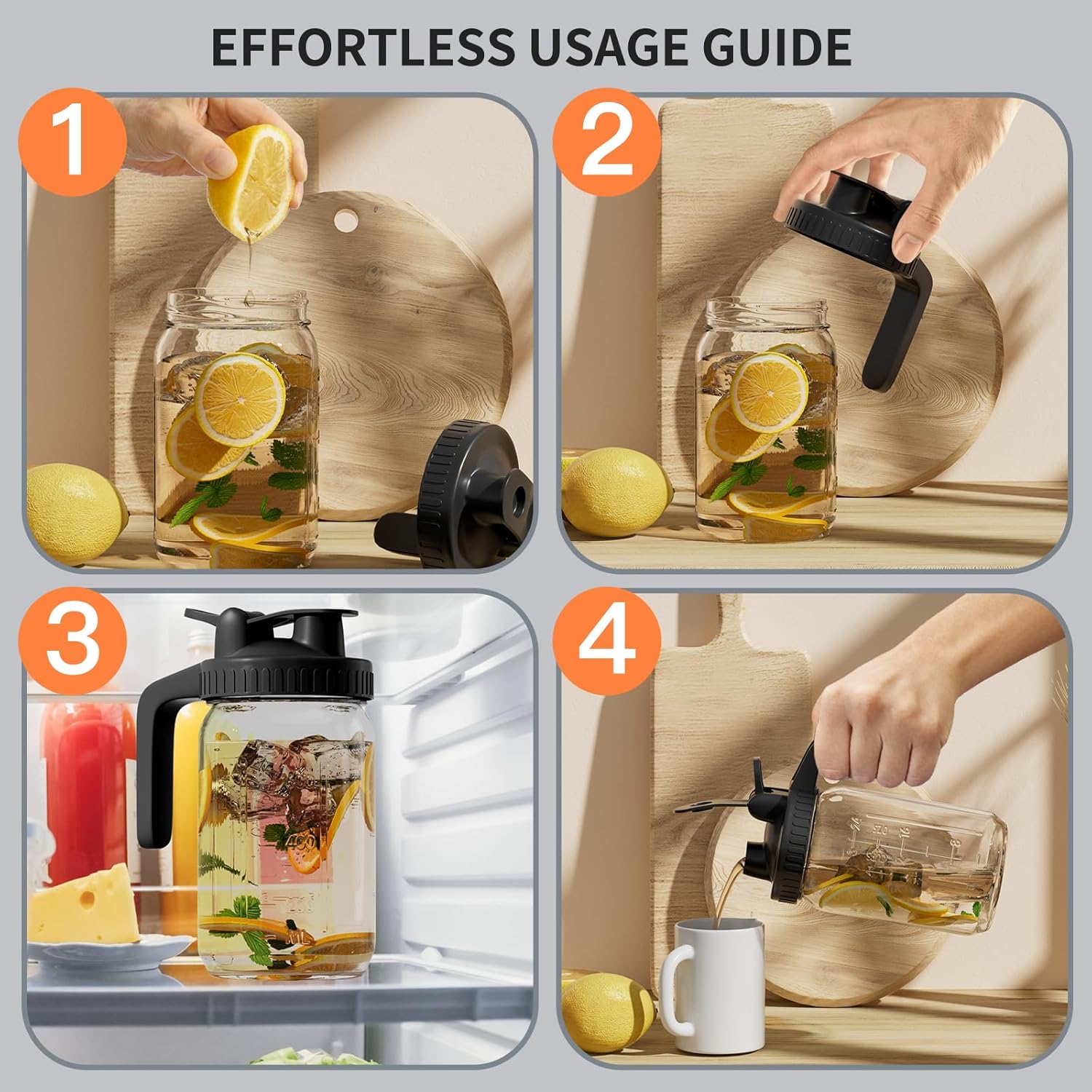 - 【Leak-Proof Freshness】 Our 32oz jug boasts a silicone-sealed pour spout lid, preserving your beverages' freshness and flavor while preventing unwanted odor mingling in the fridge. The secure flip-top lid makes pouring easy, offering a leak-proof solution.