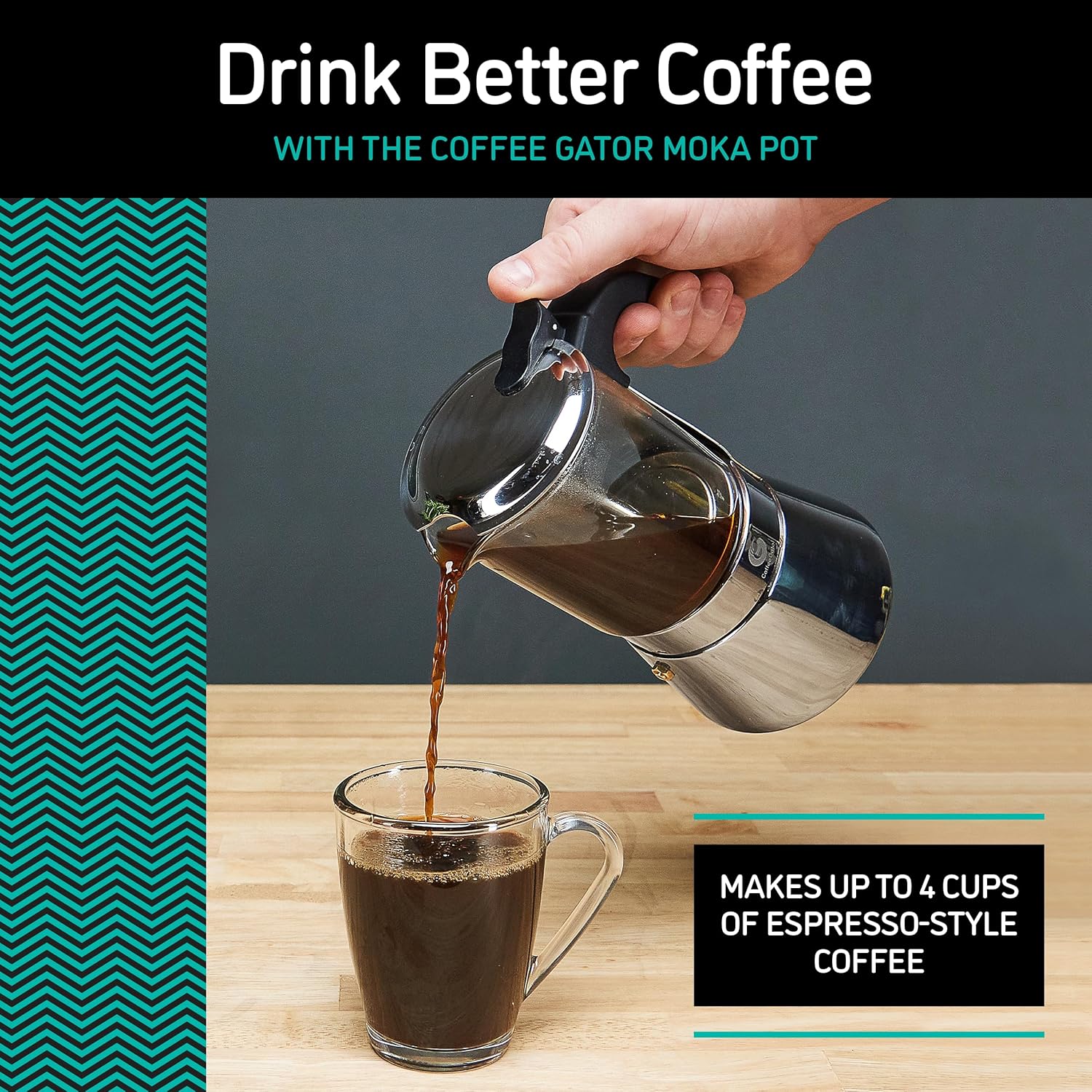 Coffee Gator 4 Cup Moka Pot, 6.7oz Stovetop Espresso Maker for Italian Coffee, Transparent Glass & Stainless Steel Design, Silver, 200ml