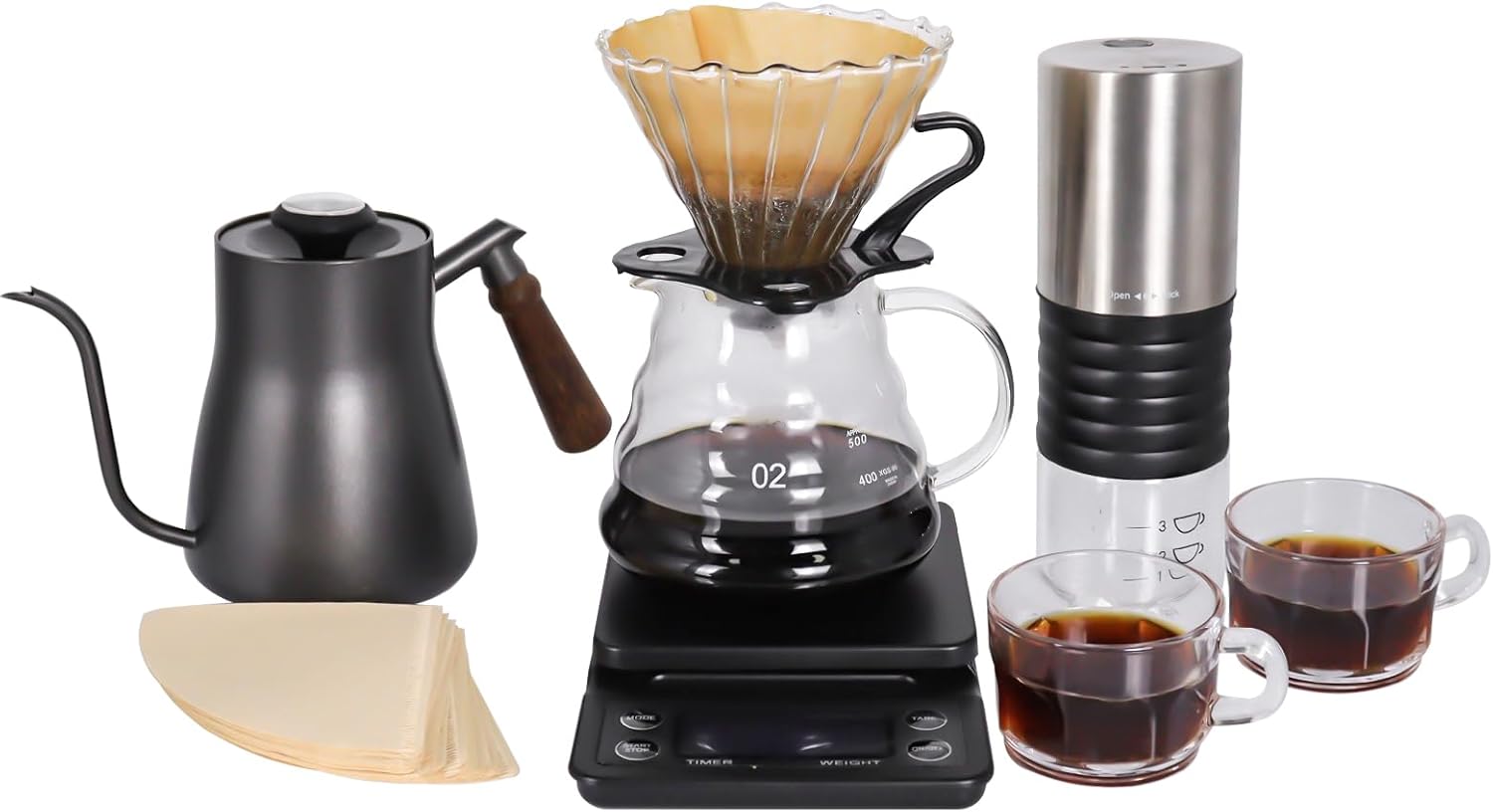 - âăSet Includesă The SOTECH Coffee Maker Set includes an electric grinder, 850ml hand brewing pot,glass dripper server,scale with timer,filter paper and a convenient travel bag. Everything you need to make the perfect cup of coffee is included in this set.