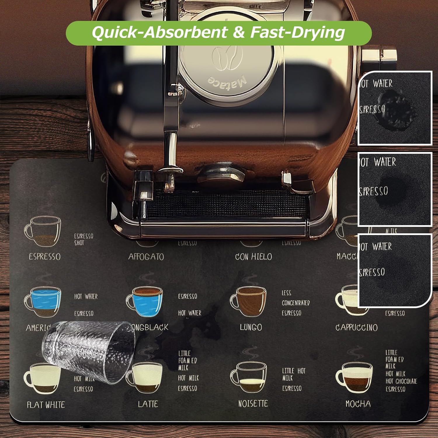 Matace Designer Coffee Bar Mat, Small 12 x 19 Inches, Rubber Backing, Absorbent Coffee Maker Mats for Dish Drying, Kitchen Countertop, Heat Resistant, Coffee Flavor Menu, Black