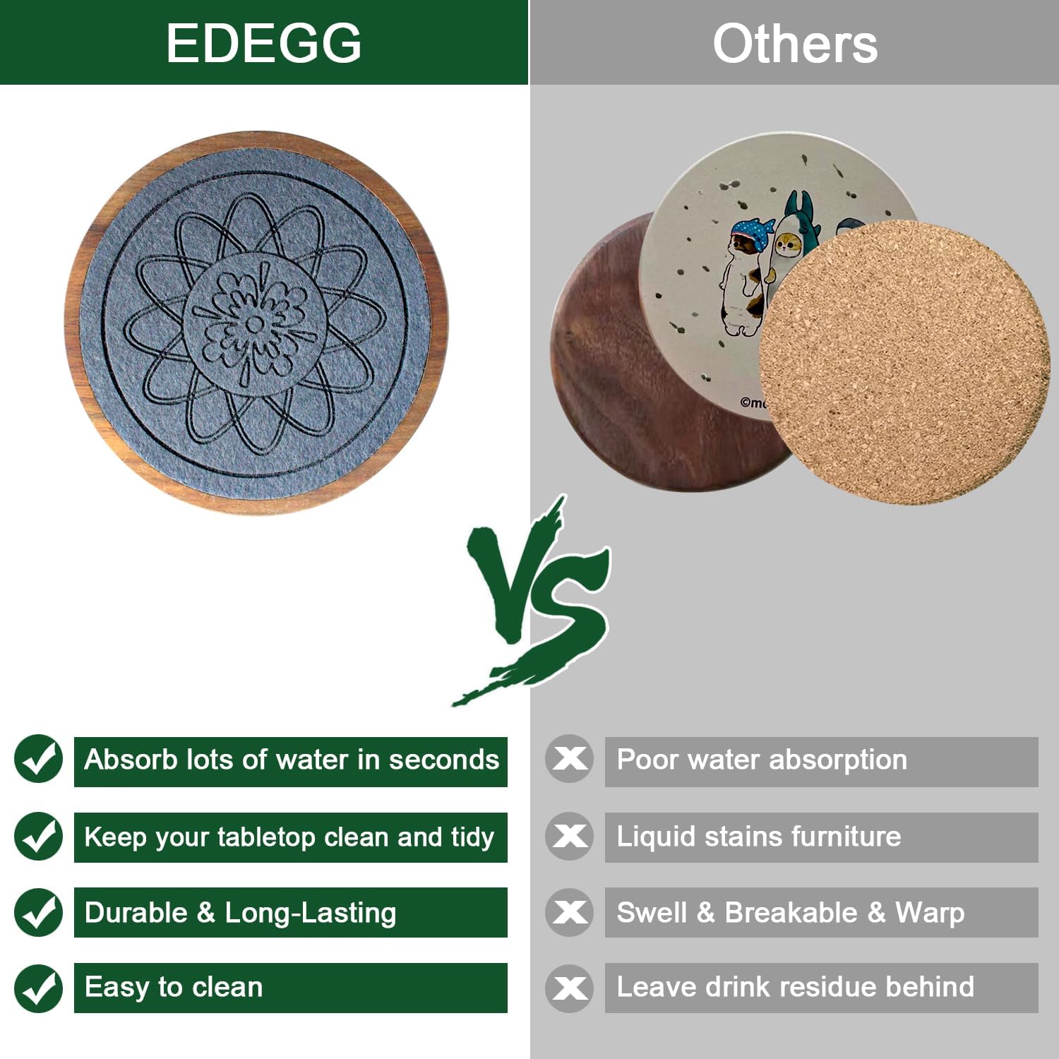 - 🍻Absorbent Coasters with Holder: Wood coasters with built-in thickened felt pads for stronger water absorption and heat insulation, capture liquids quickly were prevented any spills, keeping your tabletop clean and tidy, with no stains and water rings; extra large size easily accommodates cups of all sizes.